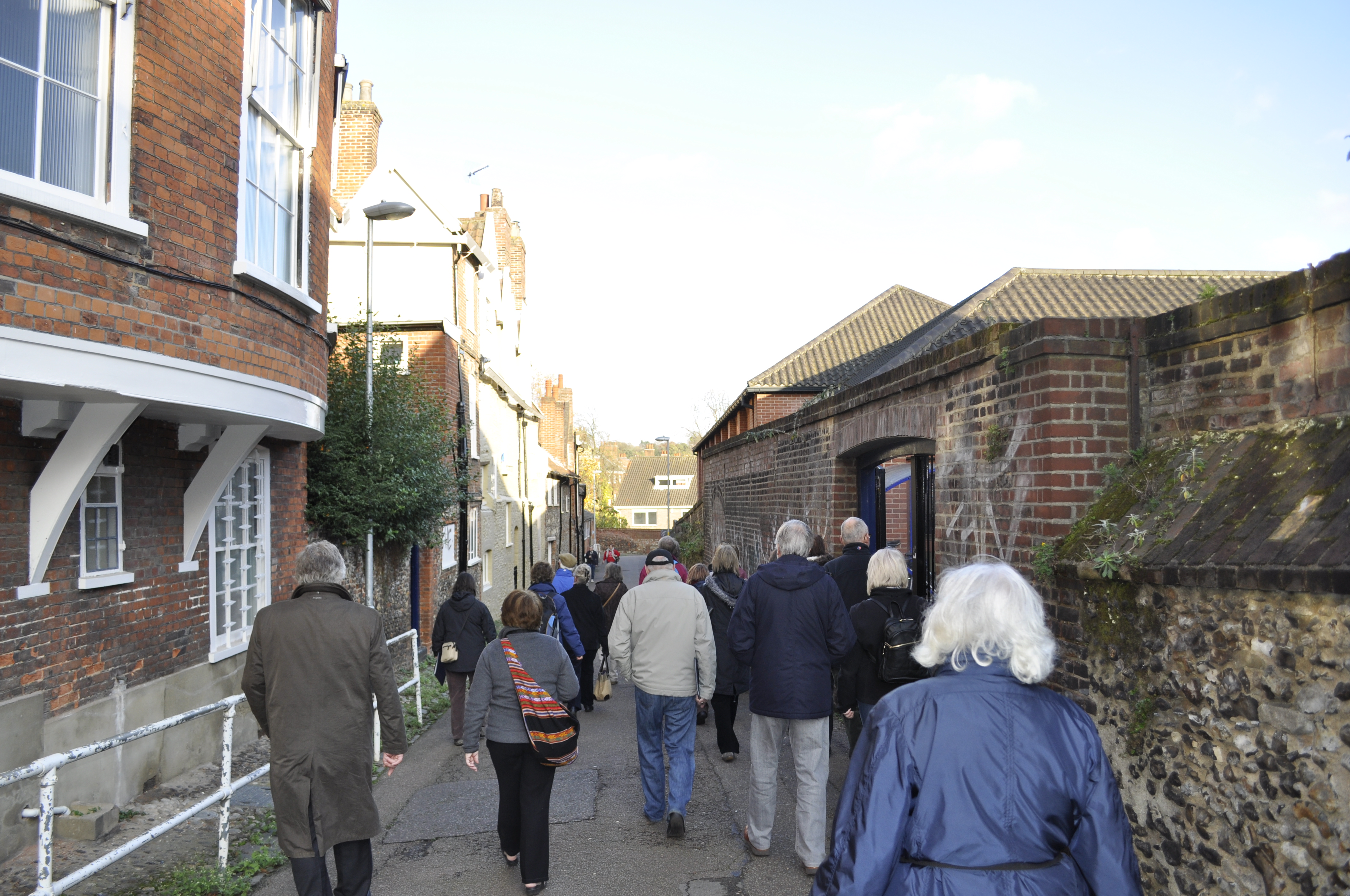 Our walk took us into Tombland where we compared our modern surroundings to Richard Wright’s 17th century map of the cathedral. We walked along St Faith’s Lane, which runs between the Cathedral Precinct and the Greyfriar’s Precinct, and eventually headed up Mountergate, where we were all sad to see the poor state of Howard House.