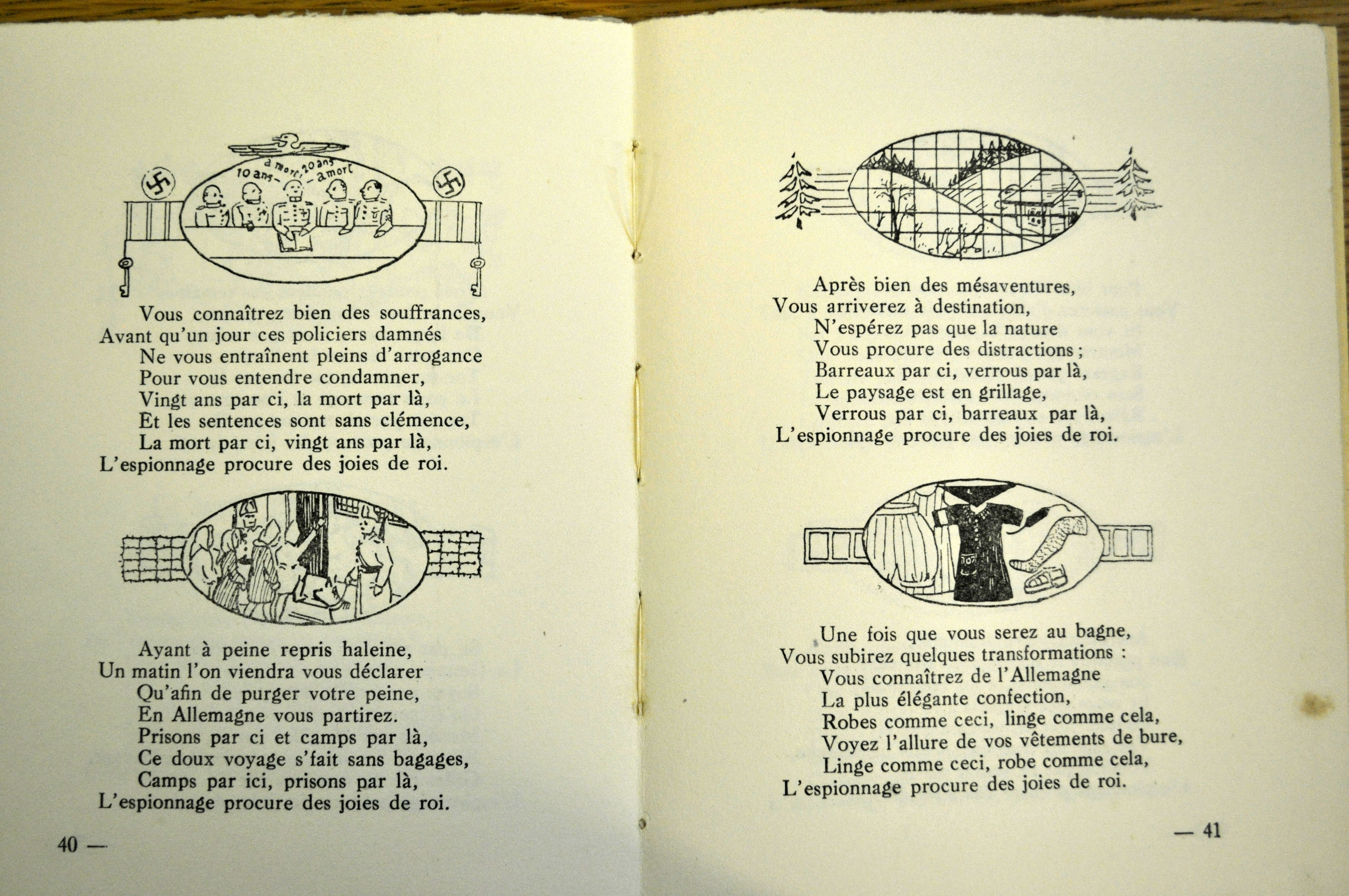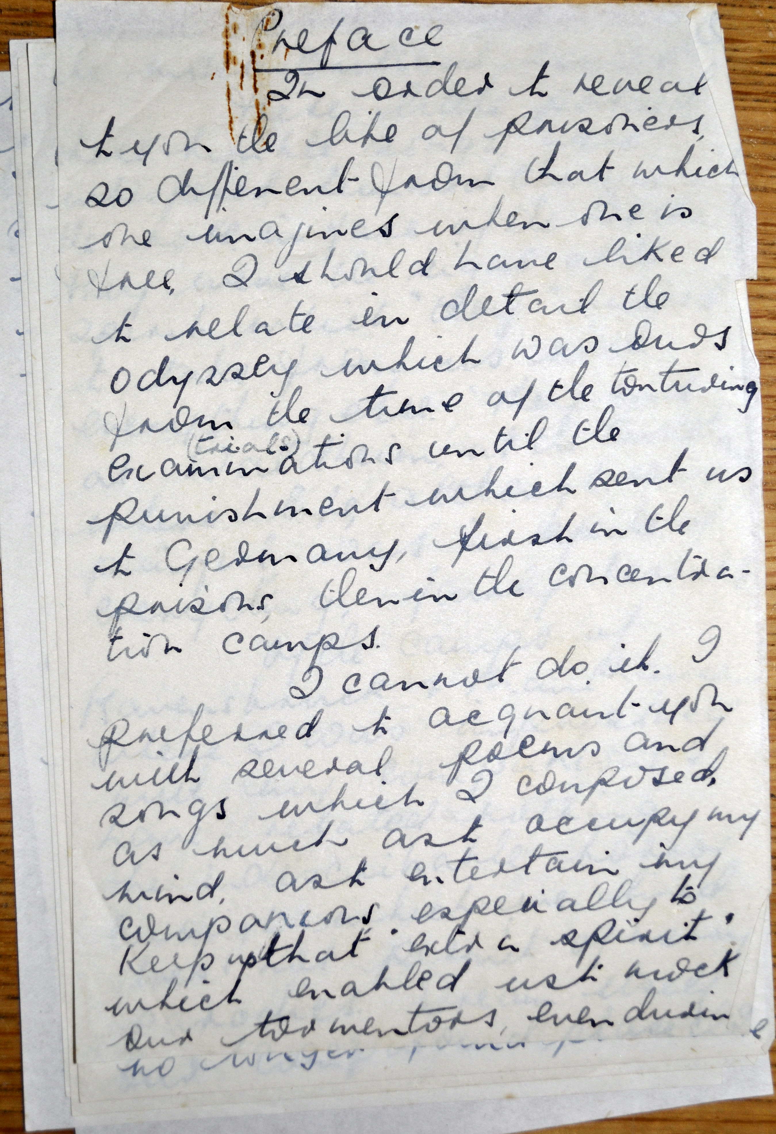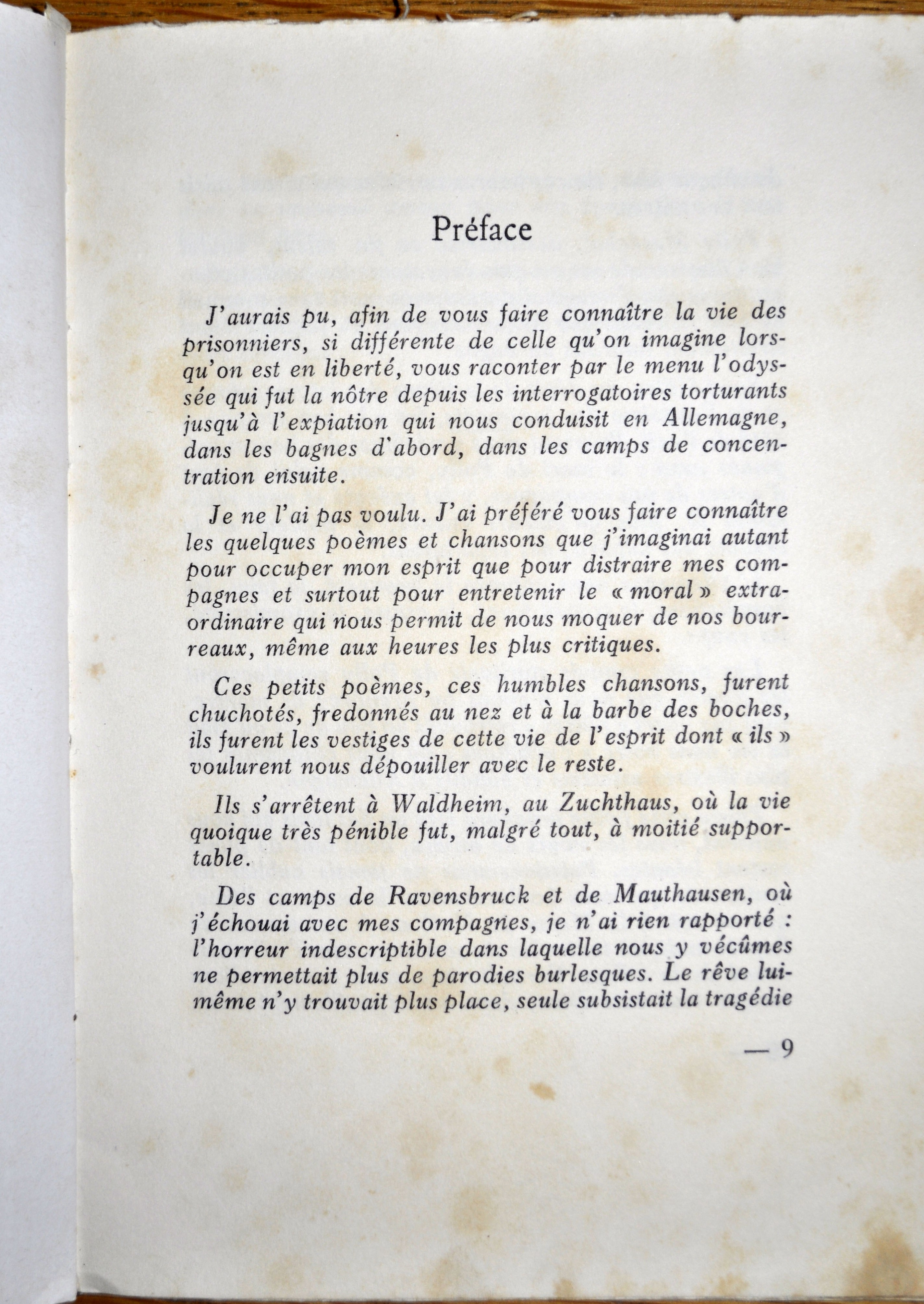 I don’t wish to do that. I prefer instead to familiarise you with a few poems and songs which I used to make up, as much to occupy myself as to amuse the people with me, but, above all, to keep up the incredible morale which allowed us to laugh at our tyrants, even at the most critical times…. May we always remember with pity all our dear departed, their suffering, their courage, their smiles their friendship, their heroic death ….