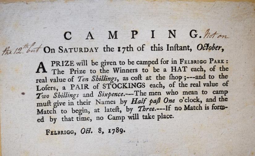 So what, exactly, was camping? This is a difficult question to answer. It appears that the game had many variants and interpretations, but most commonly two teams of equal size would line up opposite each other and ‘rush’ forwards for the ball. The object of the game was then to kick or throw the ball into the opponents’ goal. Edward Moor has provided an account of a Suffolk variant: ‘Goals were pitched at a distance of 150 or 200 yards from each other – these were generally formed of the thrown off clothes of the competitors’.