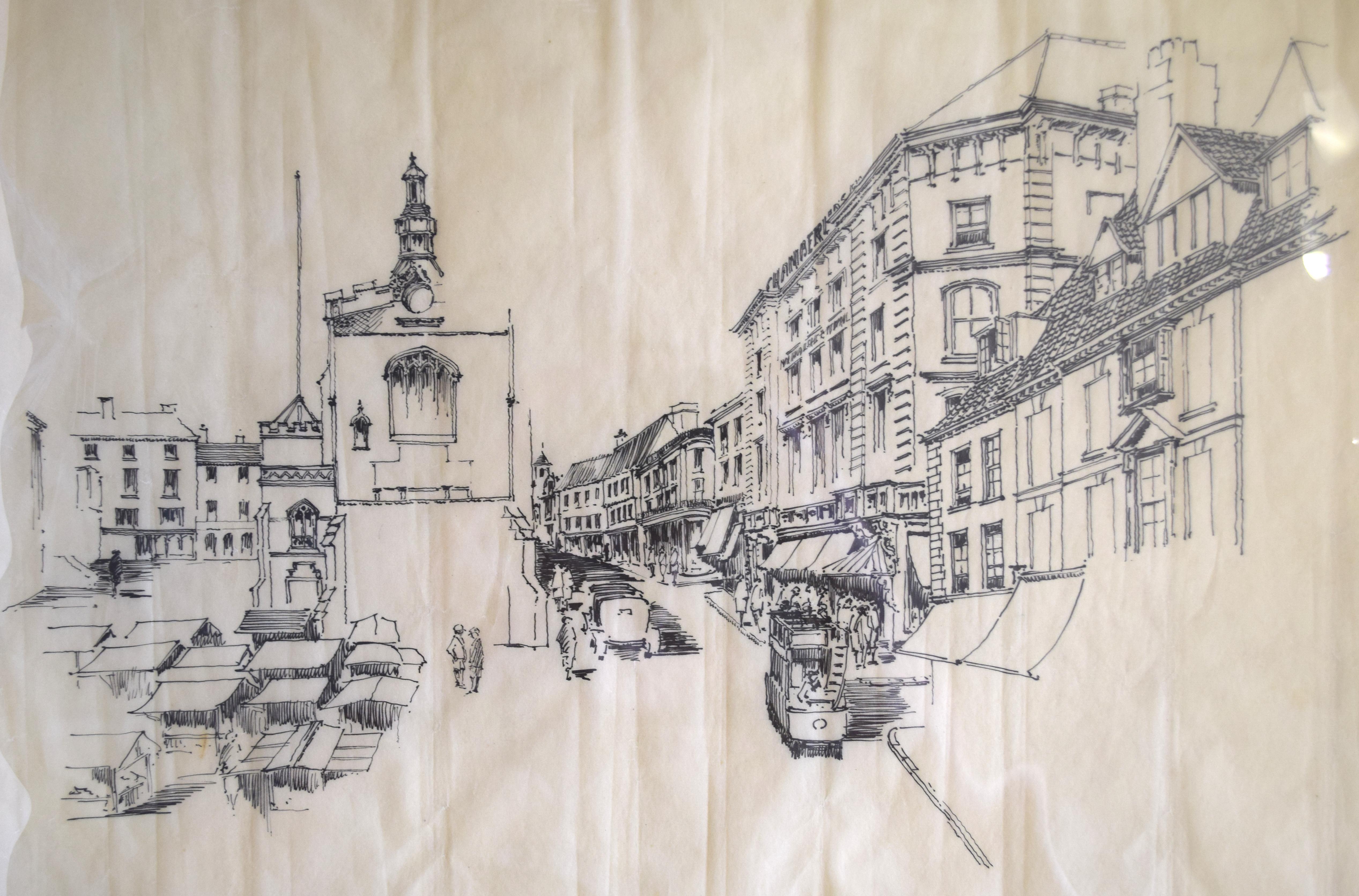 The sketch also depicts Chamberlins department store (now Tesco) on Guildhall Hill on the right. Chamberlins was the pre-eminent store in Norwich in the late nineteenth and early twentieth centuries providing a level of service unsurpassed in Norwich and the surrounding area.