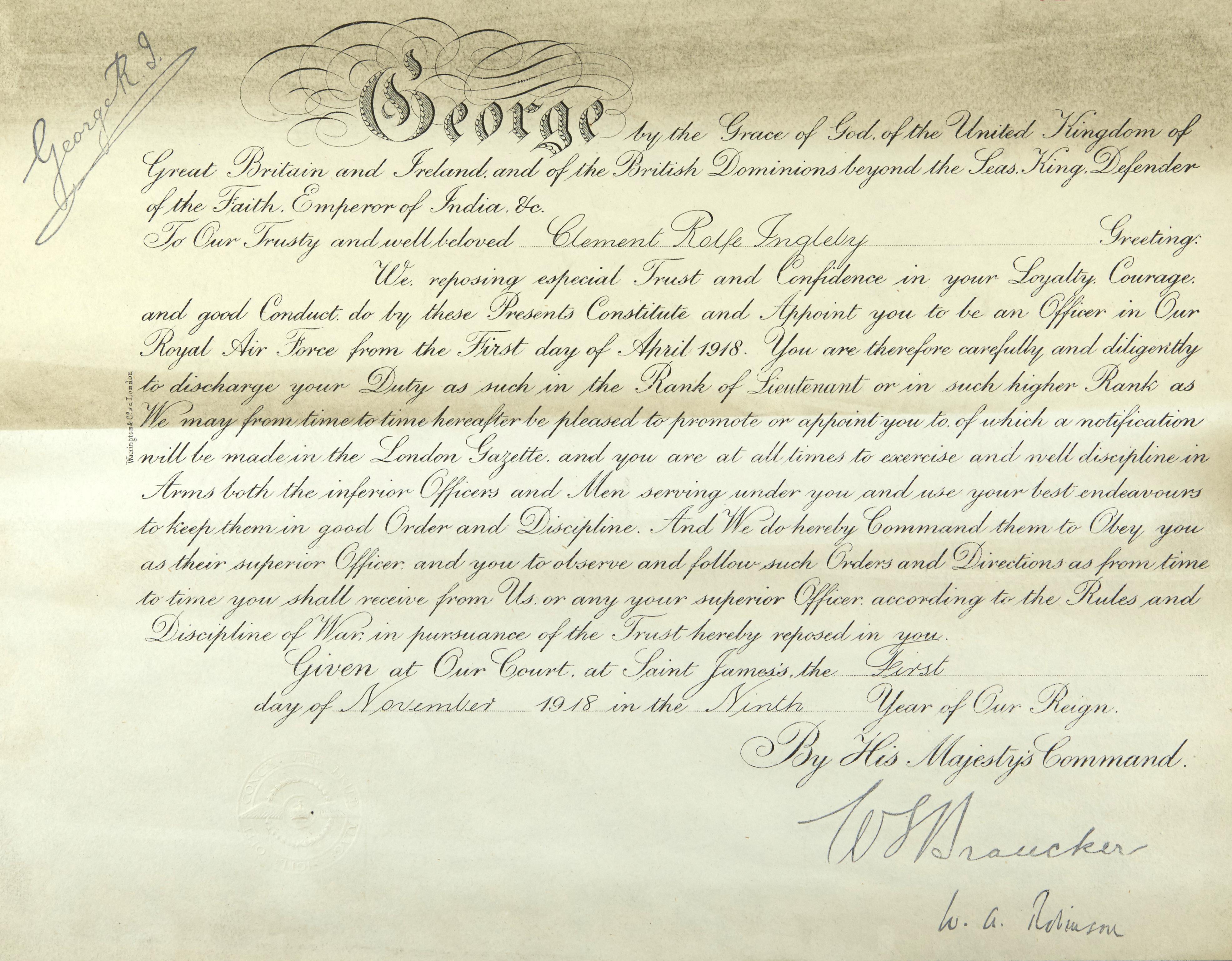The Royal Air Force was formed on 1 April 1918 and the Norfolk Record Office holds this certificate of the appointment of one of its first officers, Clement Rolfe Ingleby, which bears that exact date: