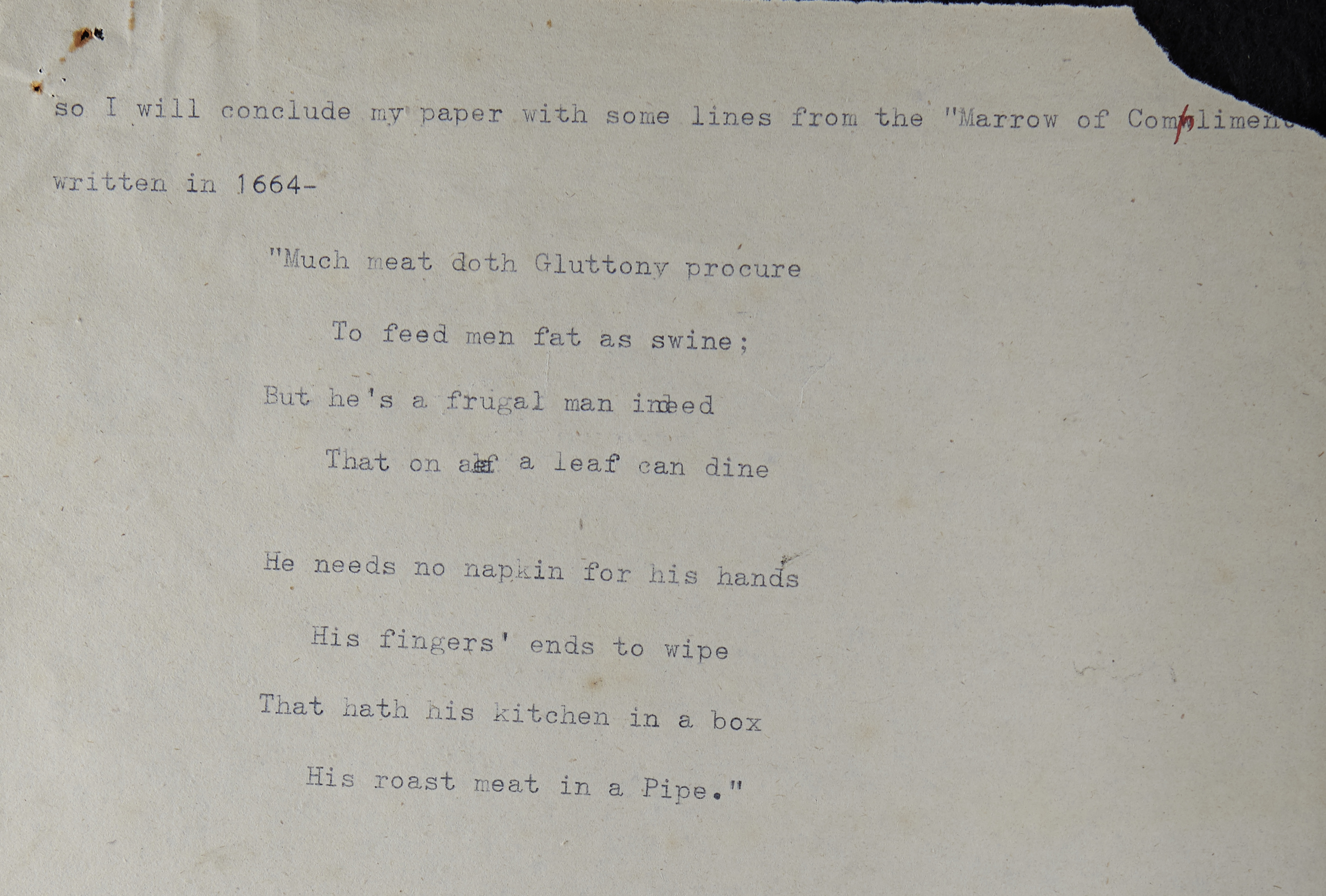 Typescript of talk entitled ‘Tobacco and Snuff in the Olden Time in England.’ Bolingbroke ends his talk with the above rhyme. NRO online catalogue entry: BOL 1/90, 739X2