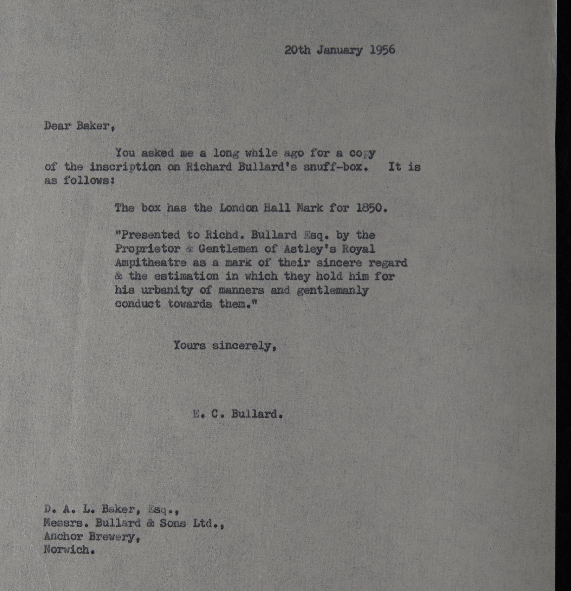 Letter dated 20th January 1956 from E.C Bullard to ‘Baker’ regarding the inscription on a snuff box. NRO online catalogue entry: BR 138/3