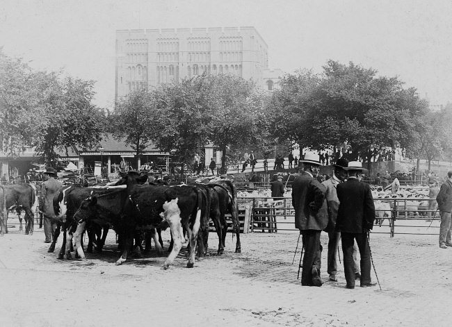 From as early as 1738, and up until the 1960s the Norwich Cattle Market was situated at Castle Meadow where Castle Mall is today. Pigs were sold on ‘Hogs Hill’ which is now renamed Timber Hill, and horses were sold on Tombland. The cattle market was held upon a Saturday, and cattle would often be walked up from Trowse to the market via Kings Street. This was not always as straight forward, as the cows would often have a mind of their own.