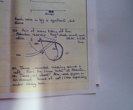 The following sounds thread throughout the notes, creating soundscapes which transport the reader to the recordist’s side;