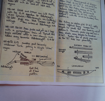 A particular delight in the notebooks are the hand-drawn sketches of railway lines illustrating the text: e.g. Peterborough to March (left page) and Glasgow Queen St. To Crianlarich (right page).