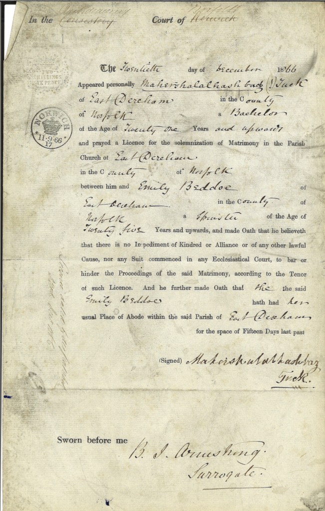 In a few cases, the backstory to some of these bonds (rarely given in the document itself) is recounted in other sources. One such story relates to Mahershalalhashbaz Tuck and Emily Beddoe who applied for a licence to be married at East Dereham on 20th December 1866. Their wedding took place there a few days later.