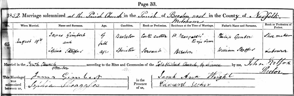 Unsurprisingly, many licence bonds have not survived and we only know of the following caper relating to the marriage of James Gimbert, of King’s Lynn, and Sophia Steggles, of Beeston, from the Revd Armstrong’s diary: