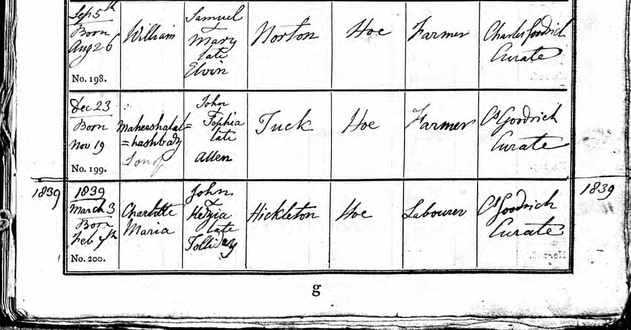 Mahershalalhashbaz was the fourth child of John Tuck and Sophia (née Allen) and both father and son were landlords of the Cherry Tree Inn at East Dereham. The story of how Mahershalalhashbaz was named (the name appears in the bible, Isaiah, Chapter 8) became a local legend in Hoe when he was baptised on 23rd December 1838.