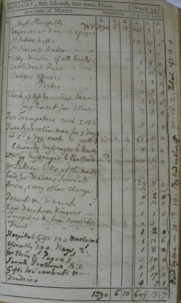 Consequently 1791 was a busy year for Fenn. On 17 March 1791 he wrote: My tenants, Javelin men, Trumpeters came to Dereham to attend me to Thetford assizes as High Sheriff for the County of Norfolk.