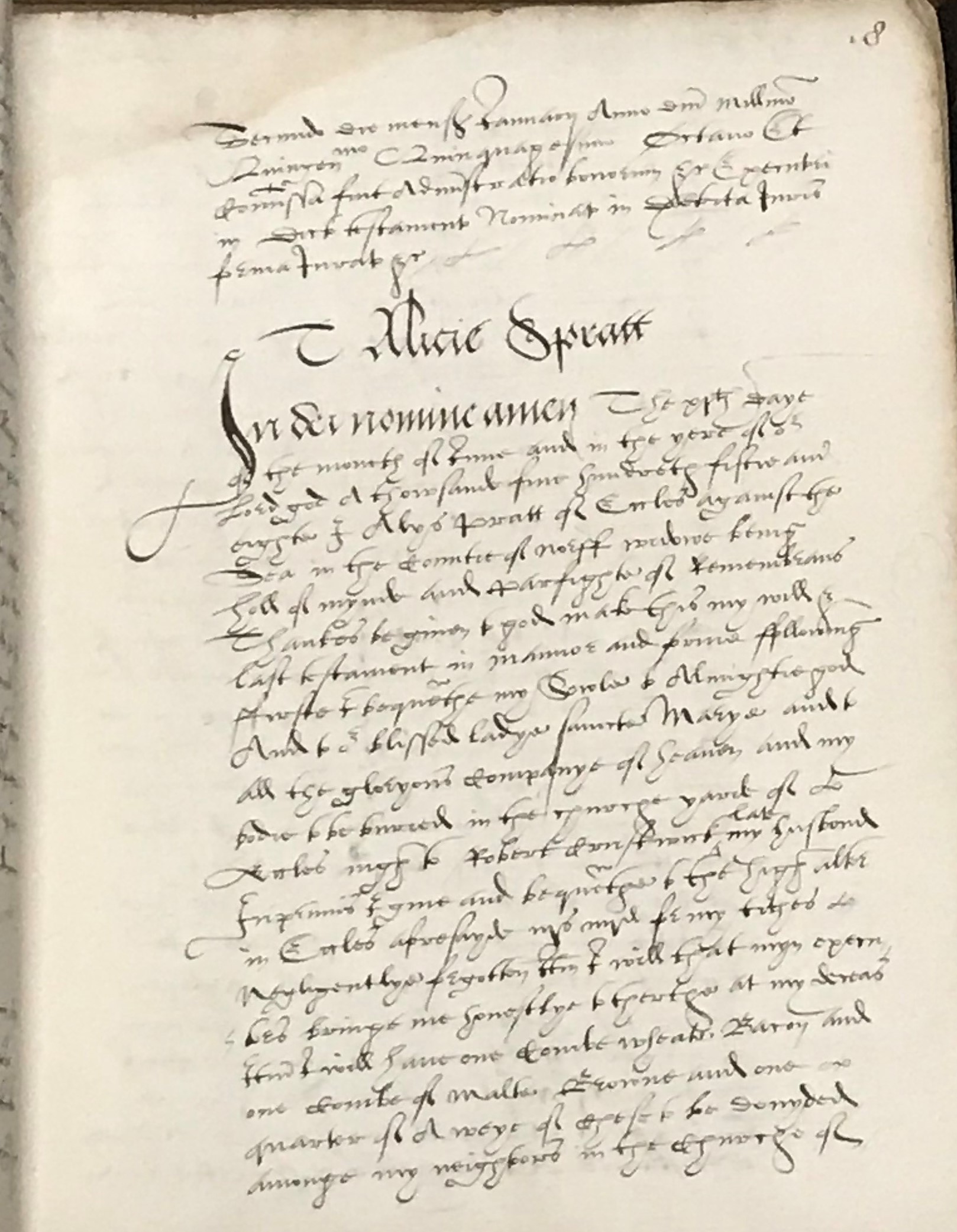 The will of Alice Spratt [1] dated January 11th 1558/1559 [2] clearly shows counter-Reformation tendencies despite the fact that Catholic Queen Mary had died in the previous November and her younger sister Elizabeth now sat on the throne. Alice bequeaths her soul to ‘Almytghtie god And to our blissed ladye sainte Marye and to all the gloryous companye of heaven’, firmly Catholic sentiments which would have been heavily suppressed in her lifetime during the reign of Protestant King Edward VI [1547-1553] However, Catholicism was restored as the state religion during Mary’s reign and it seems still tolerated in the early days of Protestant Elizabeth’s reign.