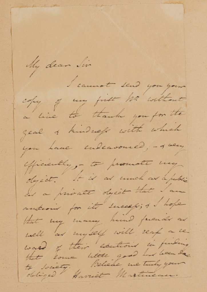 In an undated letter to Horatio Bolingbroke, Martineau thanks him for his aid in getting her ‘object’ completed. While this could signify any of her books, the final line of this letter is especially interesting. Martineau comments that she hopes it will bring a ‘little good to society’. This quotation suggests that the works created after a woman’s travels or research are integral to enacting a change. This indication of activism and an intention of revolutionising something, in however small a way, is admirable in Martineau, especially since this comes almost half a century before the women’s votes campaign and two centuries before the Black Lives Matters protests of today.