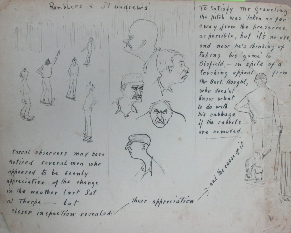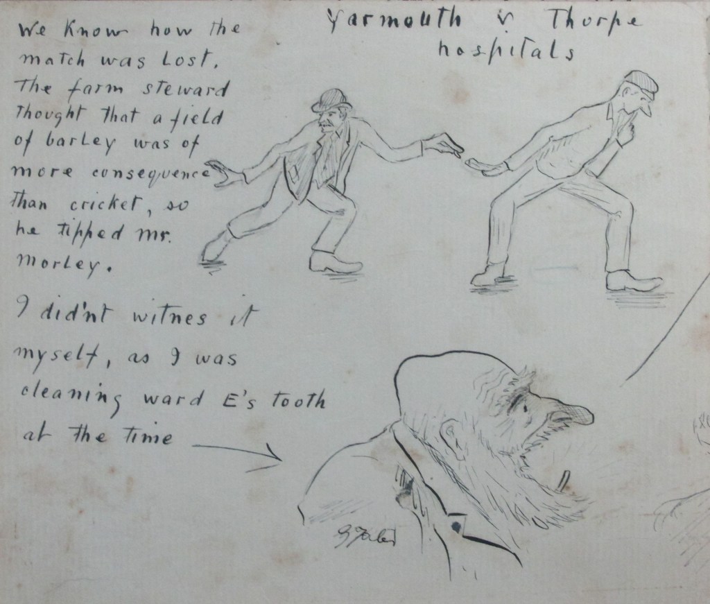 The cartoons are a light-hearted commentary of the matches, often making fun of the performance of the hospital team and include little in-jokes for the amusement of his colleagues. George, acting as an informal sports reporter, recorded matches against other local teams, such as the staff of the Gt Yarmouth Royal Naval Hospital and the Ramblers.  He drew portraits of senior staff watching from the side-lines and there is also an amusing drawing of an elderly patient, described only as ‘Ward E’s tooth’.
