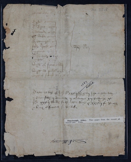 The back of the document had a small strip of paper added, probably at some time in the 19th – early 20th century on which is printed the words, ‘Depybrough, Abbey. Two pages from the record of. Dated 1567. Folio’ and a further written inscription which reads ‘1567 Dated’ with a line pointing to a date in the original text. However, this date has been mistranscribed, the original reads, ‘the last of July Ao xxxvij Rex H viij’. This is the Regnal form of the date in Roman numerals which transcribes as ‘the last day of July in the 37th year of the reign of King Henry VIII’, and translates as July 31st in the Calendar year 1546.[1]