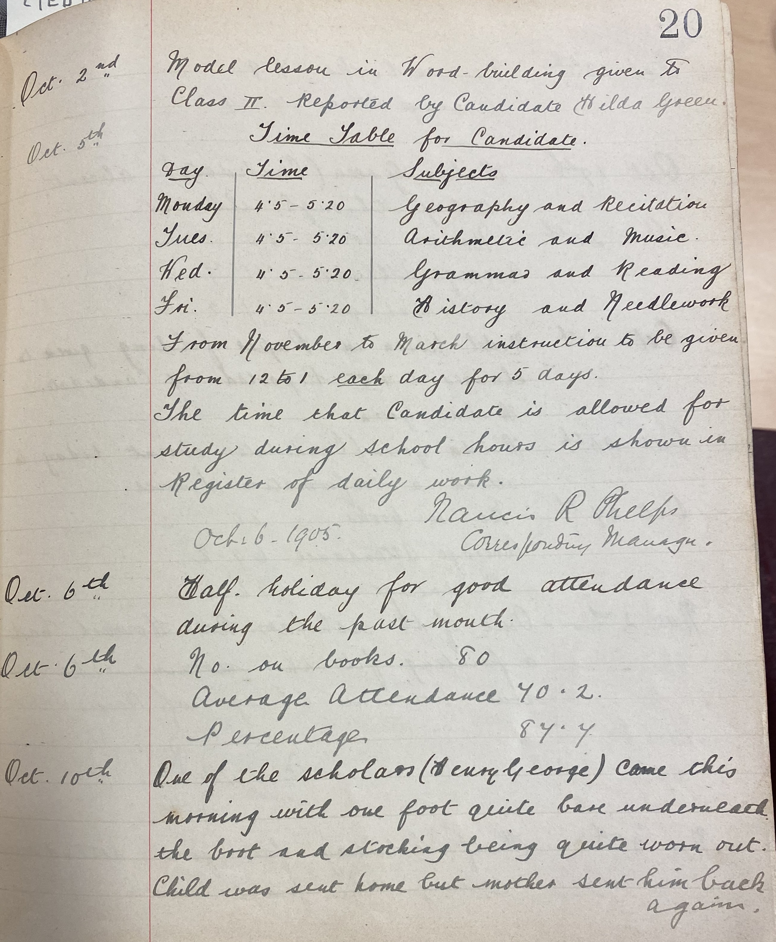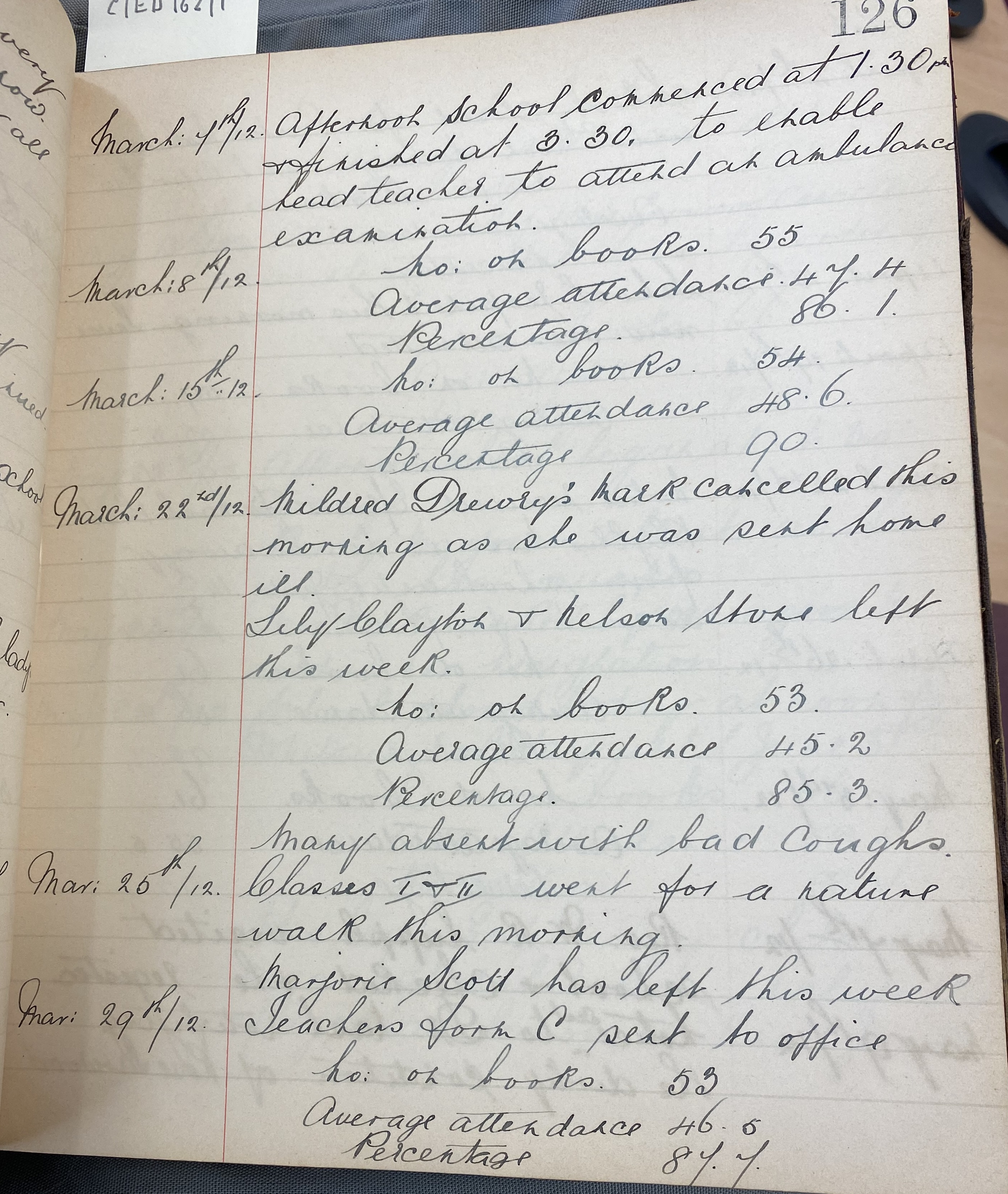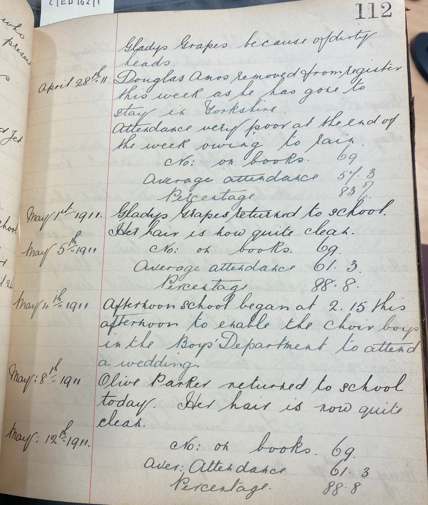 Yet attitudes to attendances haven’t only changed regarding absence – rewards congratulating good attendance have drastically changed since the early 20th Century. The logbook records half-holidays given at the beginning of some months for good attendance. In a modern school, certificates are awarded at the end of each term to congratulate only those with 100% attendance. This is a stark contrast to the half-holidays awarded to any child with good attendance 100 years ago; it was accepted that children wouldn’t be in school daily in the early 20th Century. The number on the books, attendance and percentage were taken weekly – the photograph below shows two examples of the attendance records being taken – not once between 1904 and 1918 was the percentage at 100%. Sometimes, if very few children have 100% attendance for the year in a modern school, book tokens are gifted as a special reward to children with perfect attendance at the end of the year.