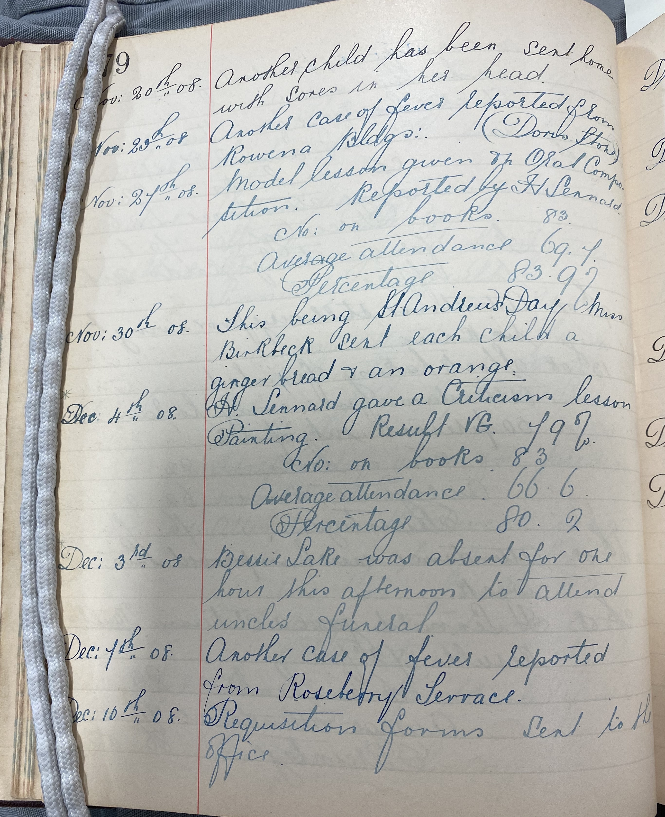 Whilst school trips form exciting opportunities away from the classroom, there some special events are celebrated inside the classroom. For example, in the photograph below, November 30th 1904 was St Andrew’s Day, Miss Birkbeck visited the school during the morning and “gave to each child a gingerbread cake and orange”. Whilst cake and fruit are no longer gifted to each child by a visitor, each school has its own way to mark days of importance.