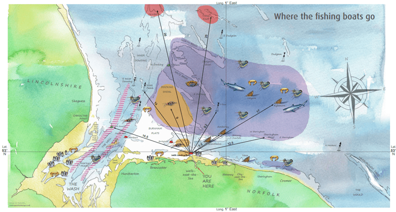 Today, the primary catch in the fishing grounds surrounding Wells Harbour is crab and lobster. This catch is sold mainly to local shops, restaurants and supermarkets. The Wells Harbour website states that seventeen boats still fish all year round, with vessels from other ports visiting to fishing grounds too. This map shows the areas fished today: Docking Shoal, Race Bank, North Ridge, Dudgeon Shoal and Lynn Well.