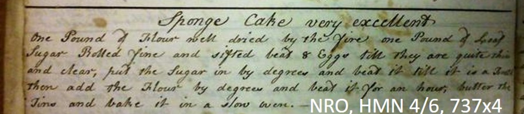 This 18th recipe for a Sponge cake from the Hammond family of Westacre collection, NRO, HMN 4/6, it offers extra insights into the stages of cake making, drying the flour by the fire, rolling your sugar until it is fine, and finally beating the mixture for an hour!