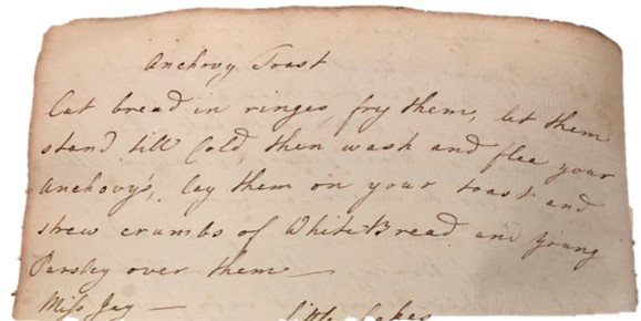 This early 19th century recipe for Anchovy Toast (Norfolk Record Office, MC 43/6) from the Foster, Cubitt and Weston family papers, seems very modern.