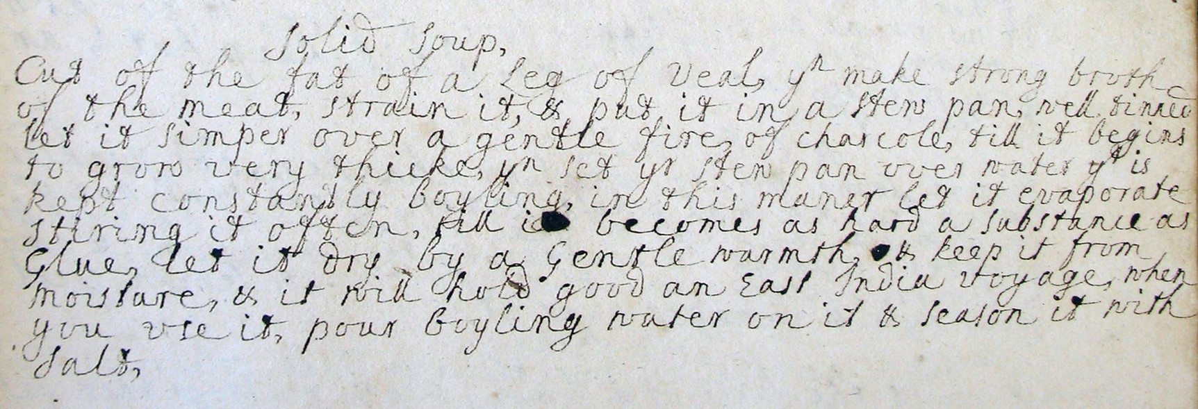 A Book of Cookery and Housekeeping’ dated 1707 from Ketton-Cremer’s of Felbrigg Hall collection (NRO, WKC 6/457) has this intriguing recipe for Solid Soup which would be taken on long voyages or adventures……..