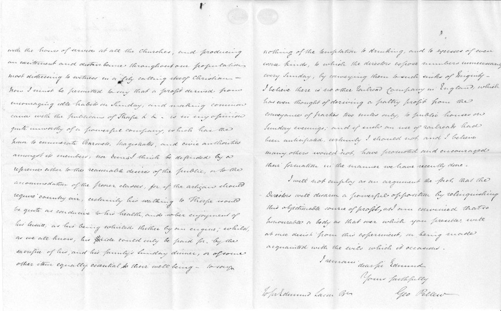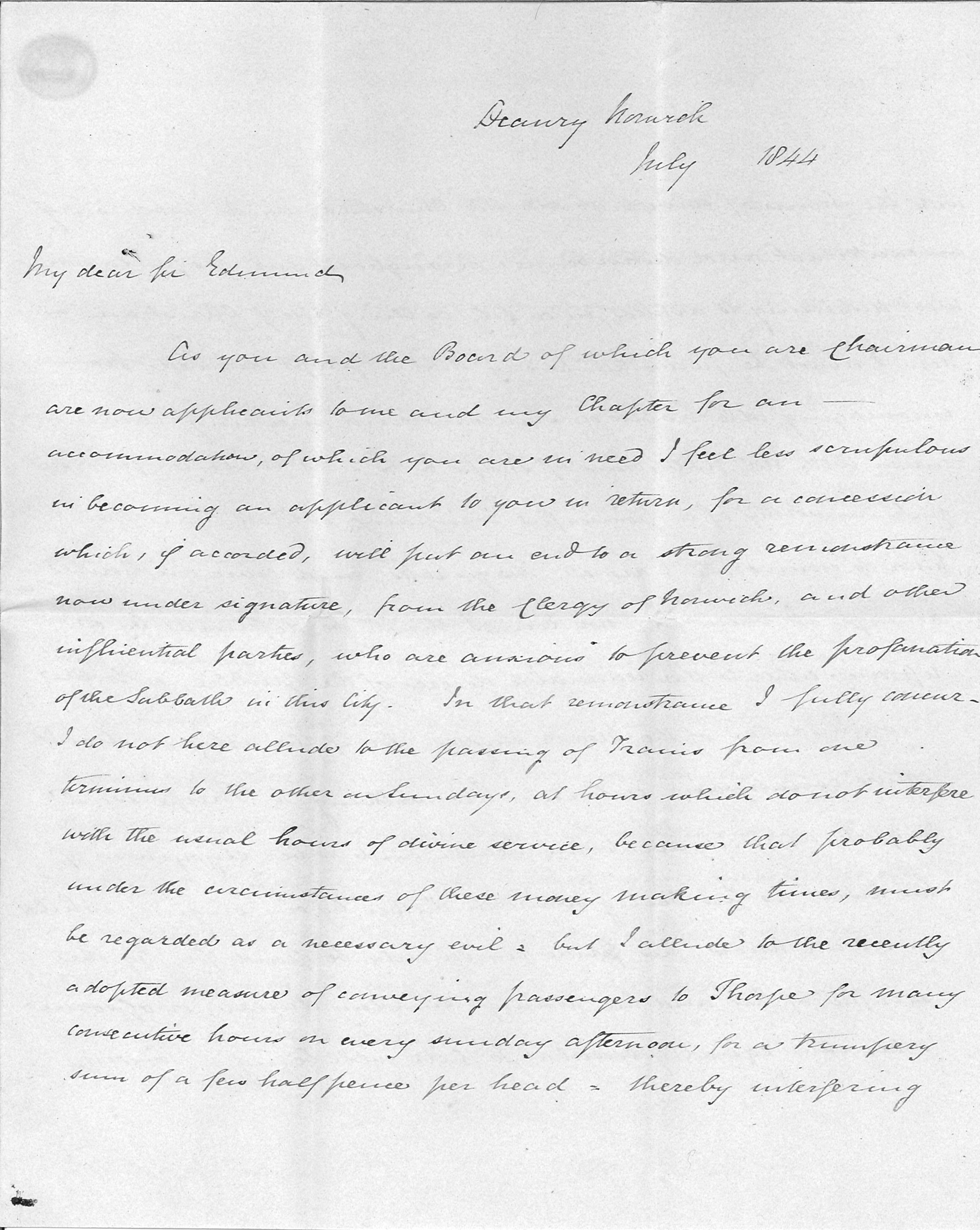Norfolk prospered in many ways as a result of the railways: merchants could get their goods to a wider British market and passenger trains meant that people living in the towns could enjoy days out by the seaside. However, not everyone was enthusiastic about the new railways and some voiced moral concerns. In 1844, the Dean of Norwich Cathedral, who was ‘anxious to prevent the profanation of the Sabbath in the city…’, wrote to Mr Edmund Lacon, chairman of the Railway Board: