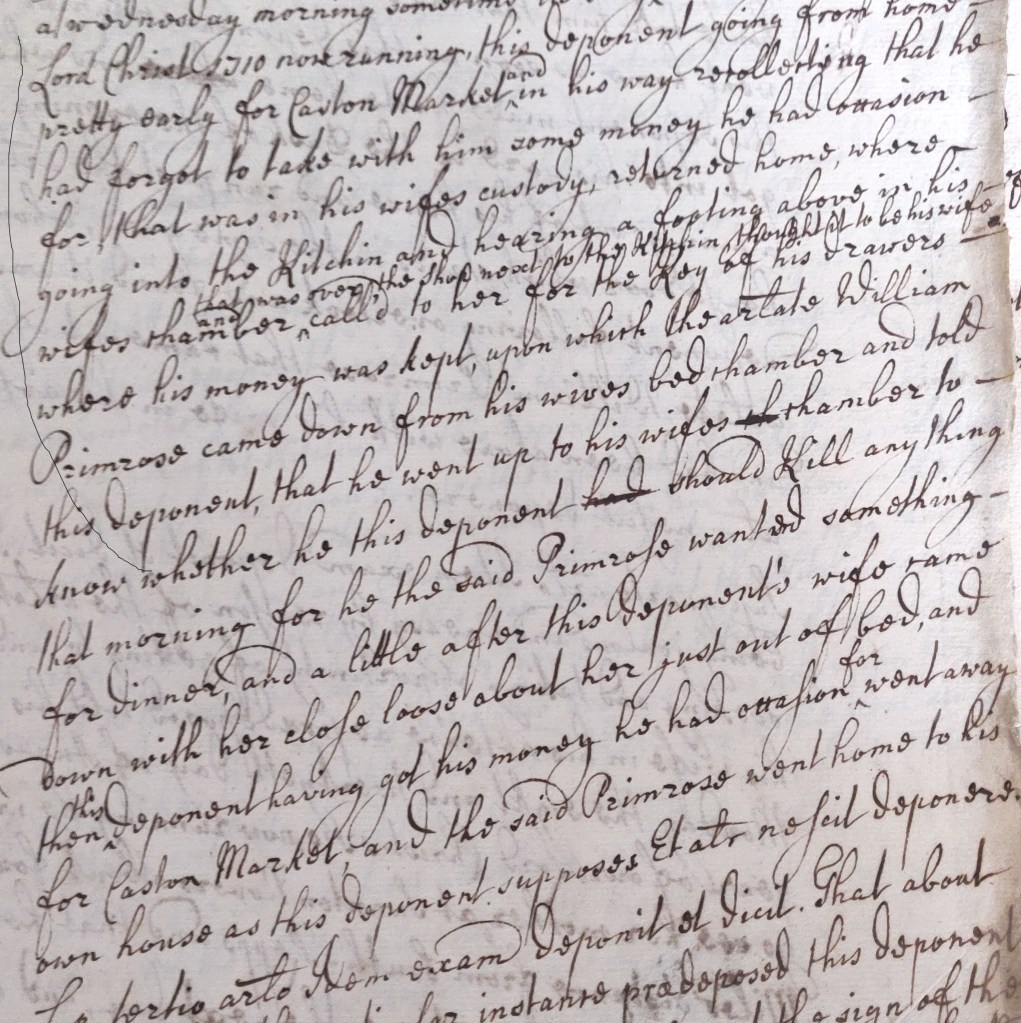It is John’s own account which offers the most detail. Firstly, he recounts how his suspicions were raised. He states how he was ‘going from home, pretty early, for Caston Market’ and having ‘forgot to take … some money … [he] returned home, where, going into the kitchen … called to her for the key of his drawers where his money was kept, upon which … William Primrose came down from his wife’s bedchamber and told [him] that he went … [there to ask her if he] should kill anything that morning for … dinner’. A short while later, Elizabeth Townsend ‘came down with her close [clothes] loose about her, just out of bed’.