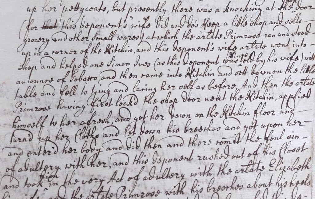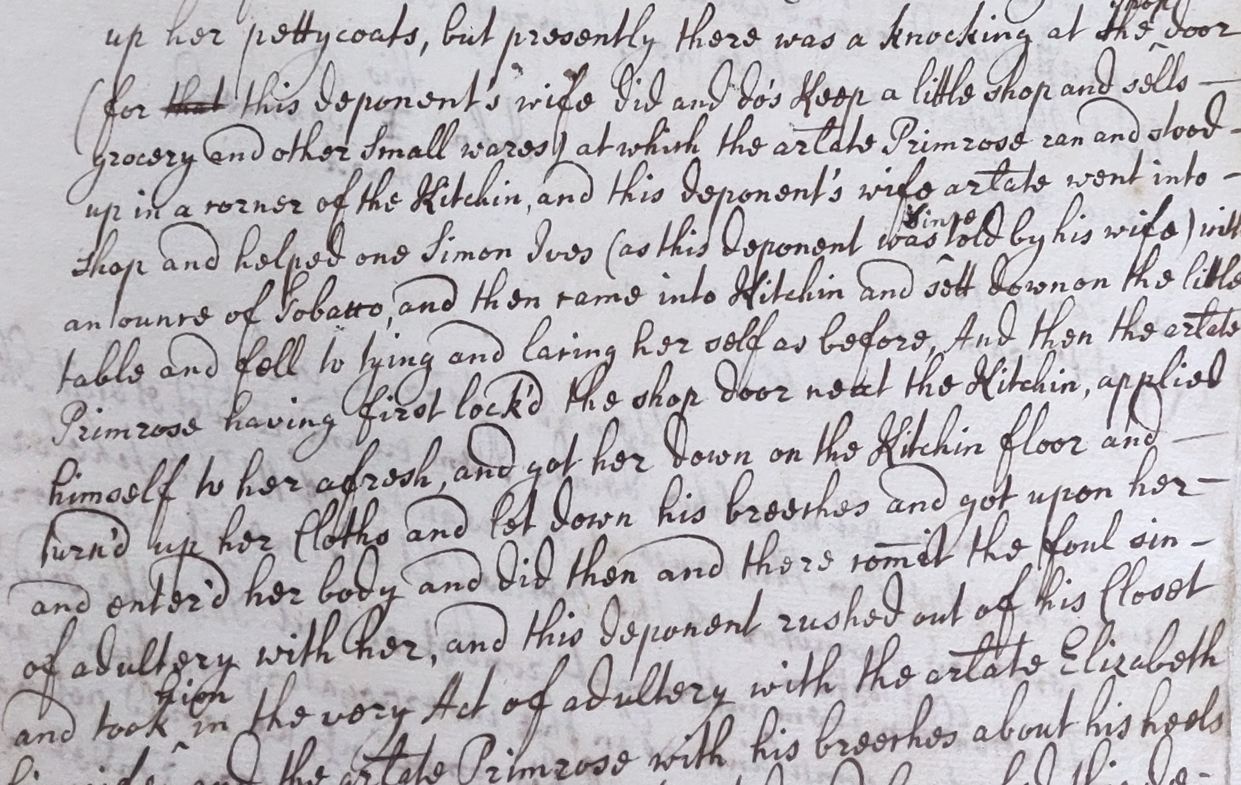 After recounting an interruption by a Simon Ives who wanted to buy some tobacco (Elizabeth Townsend ‘did and does keep a little shop and sells grocery and other small wares’), John Townsend goes into graphic detail of William Primrose and Elizabeth’s ‘foul sin of adultery’. At which point, John, rushes out of his closet with William Primrose having ‘his breeches about his heels being surprised upon his knees entreated and beseeched John Townsend (who threatened him very severely) to spare him and he would be a friend to him as long as he lived and he gave [John Townsend] a note for fifty pounds to make himself easy and after he had pretty well corrected him and a great deal of bustle and noise let him goe.’