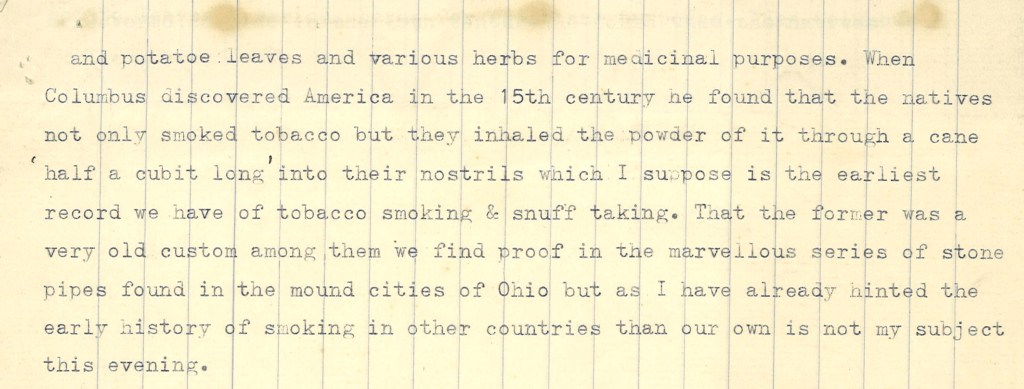 The Norfolk Record Office has the typed lecture notes which Mr Bolingbroke, solicitor and Registrar of the Diocese of Norwich, used for a talk to the Club in the late nineteenth century (NRO, BOL 1/90, 739×2). He talks about Christopher Columbus’s ‘discovery’ of America in the fifteenth century, when ‘the natives not only smoked tobacco, but they inhaled the powder of it through a cane half a cubit long into their nostrils.’ (A cubit is about 18 inches or 45.72 centimetres).