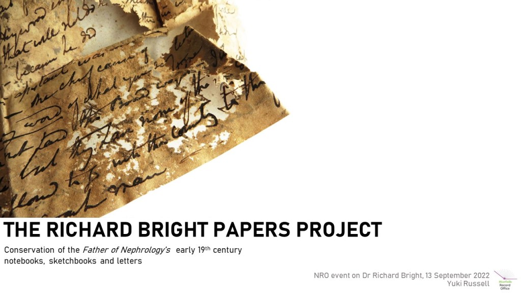To discuss Richard Bright and his research around Bright’s Disease, we had two great speakers. First was Conservator Yuki Russell, who was in charge of the project to conserve the papers of Richard Bright in the NRO collection. Yuki told us about the background to the project, from the arrival of the documents at the NRO in 1983, to the start of the project in 2014, and eventually employing a Conservator to work solely on the project. We also heard from local historian Frank Meeres, who gave us some background on Richard Bright himself and how he came to be the person to accurately describe Bright’s Disease. The talk was a hybrid event, so people joined us in person and online. Those who visited in person were treated to a display of original documents. You can view the talk about Richard Bright on our YouTube channel.