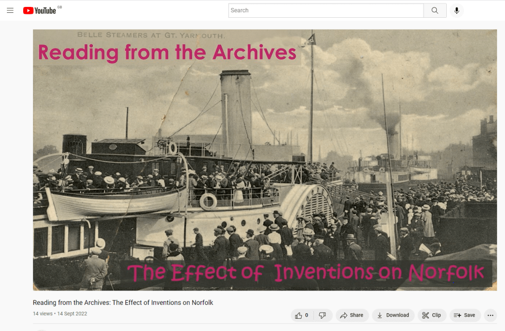 In our special Reading from the Archives, an online event where volunteers read documents from our collection, we learnt how inventions changed the lives and shape of Norfolk, with the arrival of the railways in 1844, and the invention of the aeroplane led to Norfolk having 14 United States Army Air Force Bases during the Second World War. We also heard how the steam packet allowed people to travel to Norfolk by new routes, and we hear from the journal of Mr Martin of Plaistow, who, along with his wife and daughter travelled to Cromer in September 1825. They travelled on the steam packet Hero from London to Yarmouth, and onwards to Norwich on another steam vessel, and finally a coach to Cromer where they stayed for two weeks. You can hear all these stories and more on our YouTube channel.