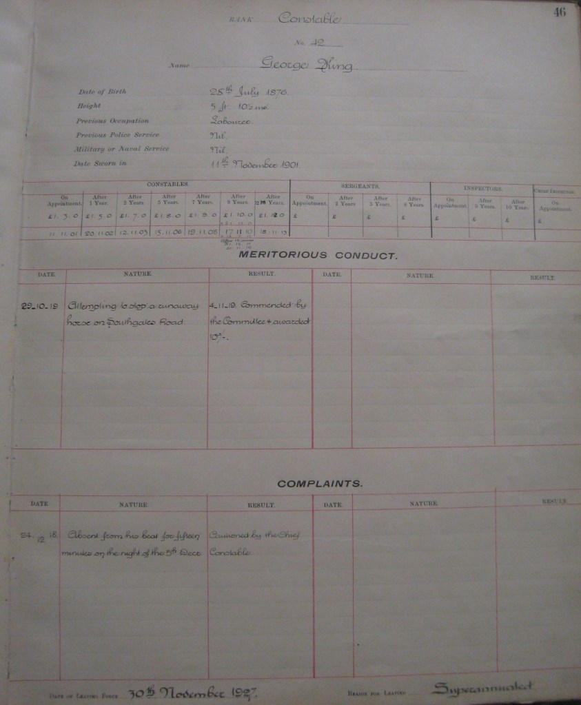 Both registers suggest that the full length of a police career at the time was around 26 years. A police pension would have given great financial security at the time. William Kirby was a fisherman from Cromer when he joined the force in 1874 at the age of 28. He retired in 1899 on an annual pension of £45 5s 2d.