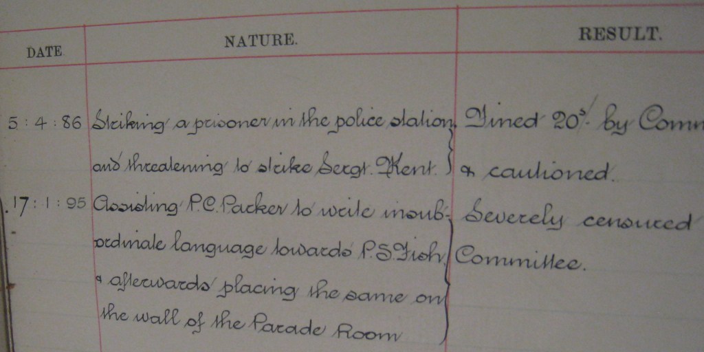 Both registers comment on good and bad behaviour. GY records meritorious conduct and complaints while KL records Rewards and Promotions and Offences. Many awards were given for stopping runaway horses; the traffic dangers of the day and many were punished for being drunk. James Hardesly served in the GY force for six years until, in 1877, he was fined 5 shillings for being absent from night duty & found at home in bed – drunk”. He went on to become a chief inspector.