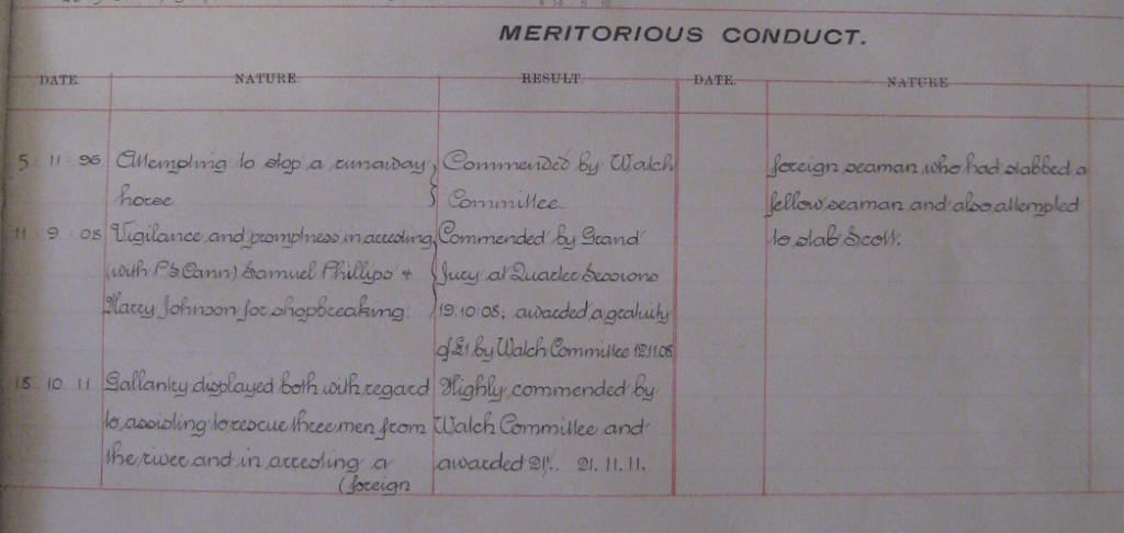 There were many awards for good conduct. James Scott served in the GY force for 26 years and was a constable throughout his career. His record shows a weekly wage of £1 3s 0d rising to £1 13s 0d after fifteen years of service. He retired in 1921. He was commended for his behaviour on more than one occasion: