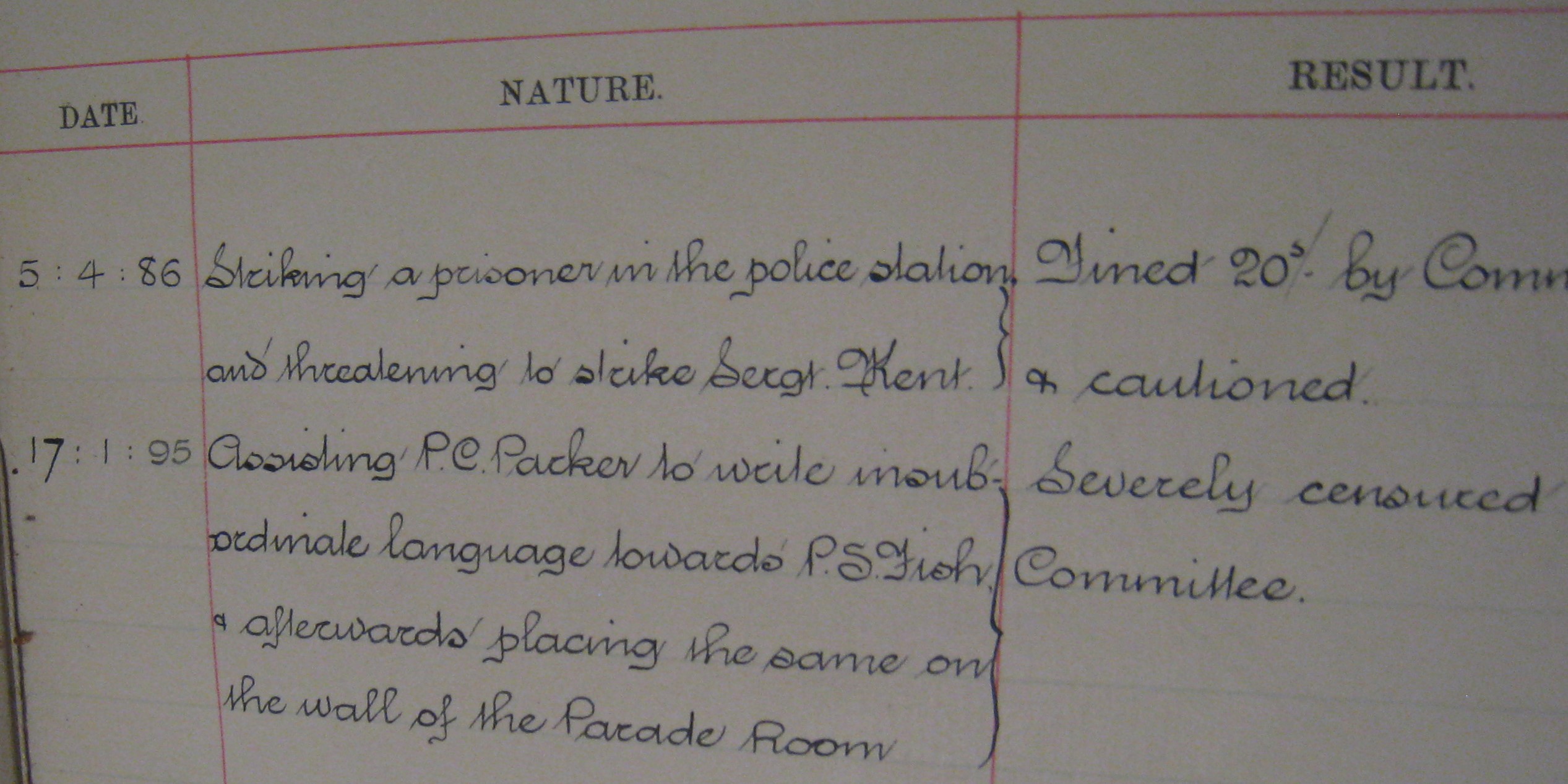 Both registers comment on good and bad behaviour. GY records meritorious conduct and complaints while KL records Rewards and Promotions and Offences. Many awards were given for stopping runaway horses; the traffic dangers of the day and many were punished for being drunk. James Hardesly served in the GY force for six years until, in 1877, he was fined 5 shillings for being absent from night duty & found at home in bed – drunk”. He went on to become a chief inspector.