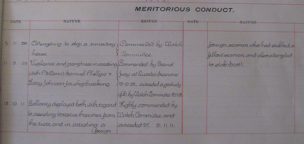 There were many awards for good conduct. James Scott served in the GY force for 26 years and was a constable throughout his career. His record shows a weekly wage of £1 3s 0d rising to £1 13s 0d after fifteen years of service. He retired in 1921. He was commended for his behaviour on more than one occasion: