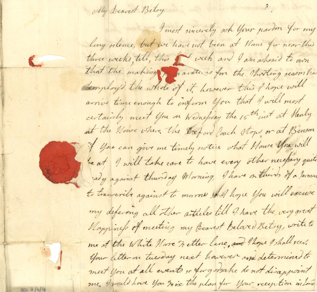 Edward’s reference to the ‘completion of our happiness’ presumably refers to the marriage itself, and he was keen to sort out the details of where they will meet.