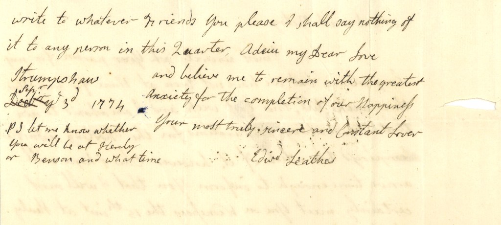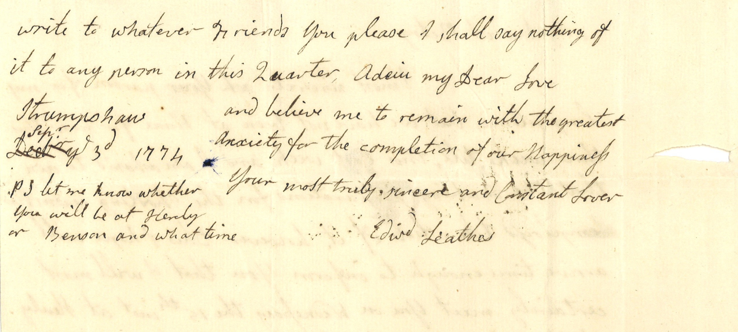 3 September 1774, letter from Edward Leathes to Elizabeth ‘Betsy’ Reading. NRO, BOL 2/6/14