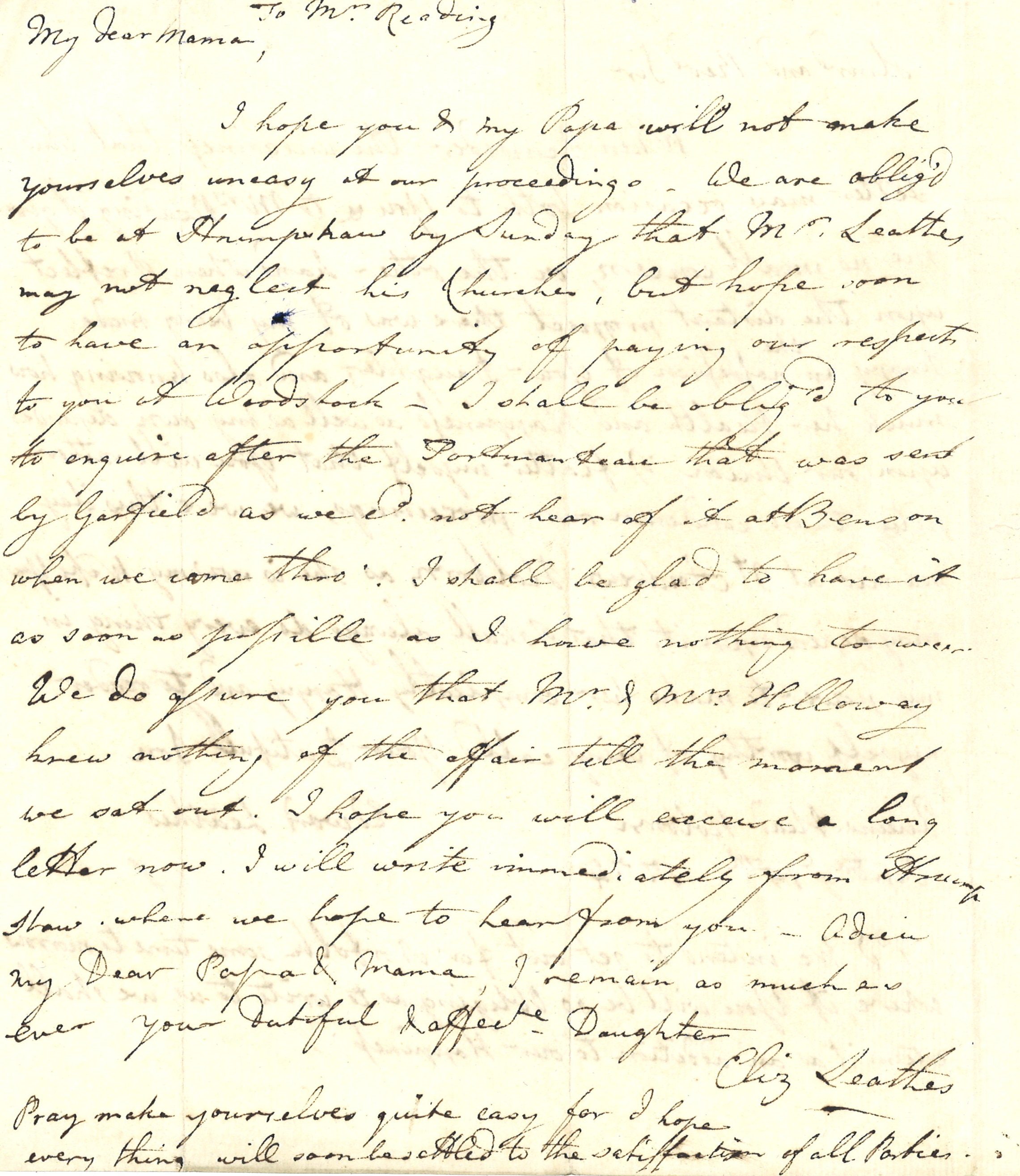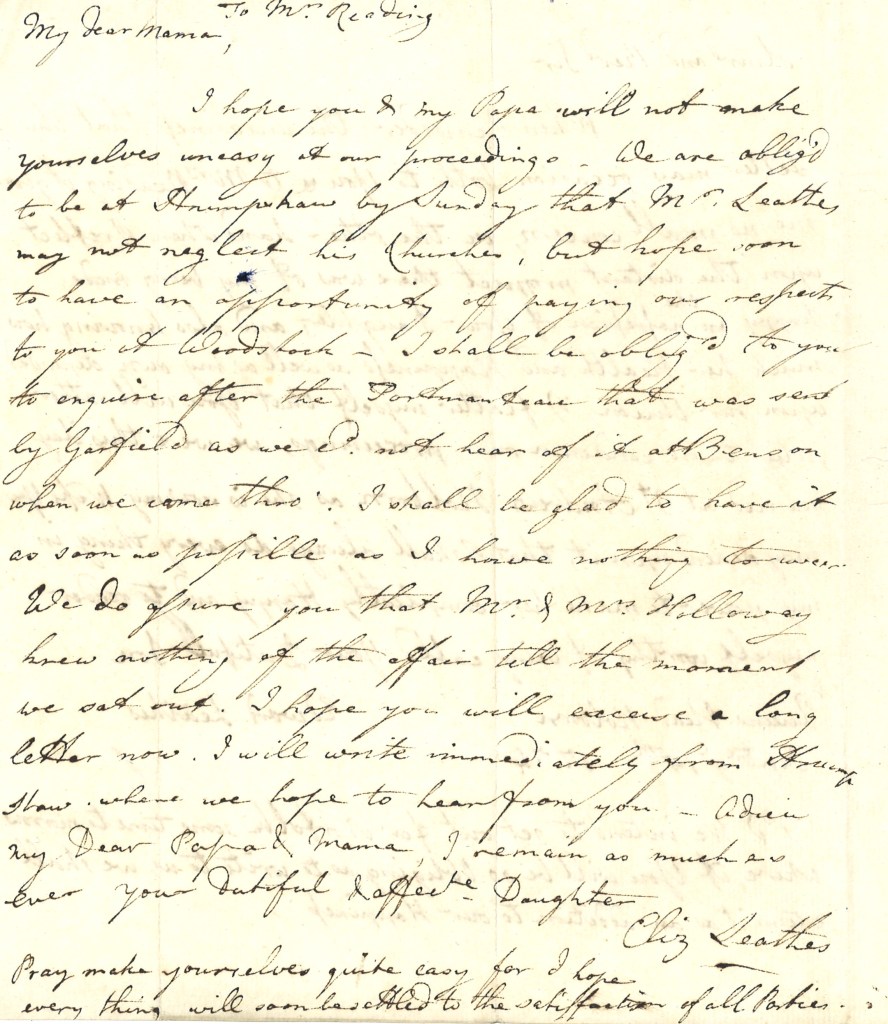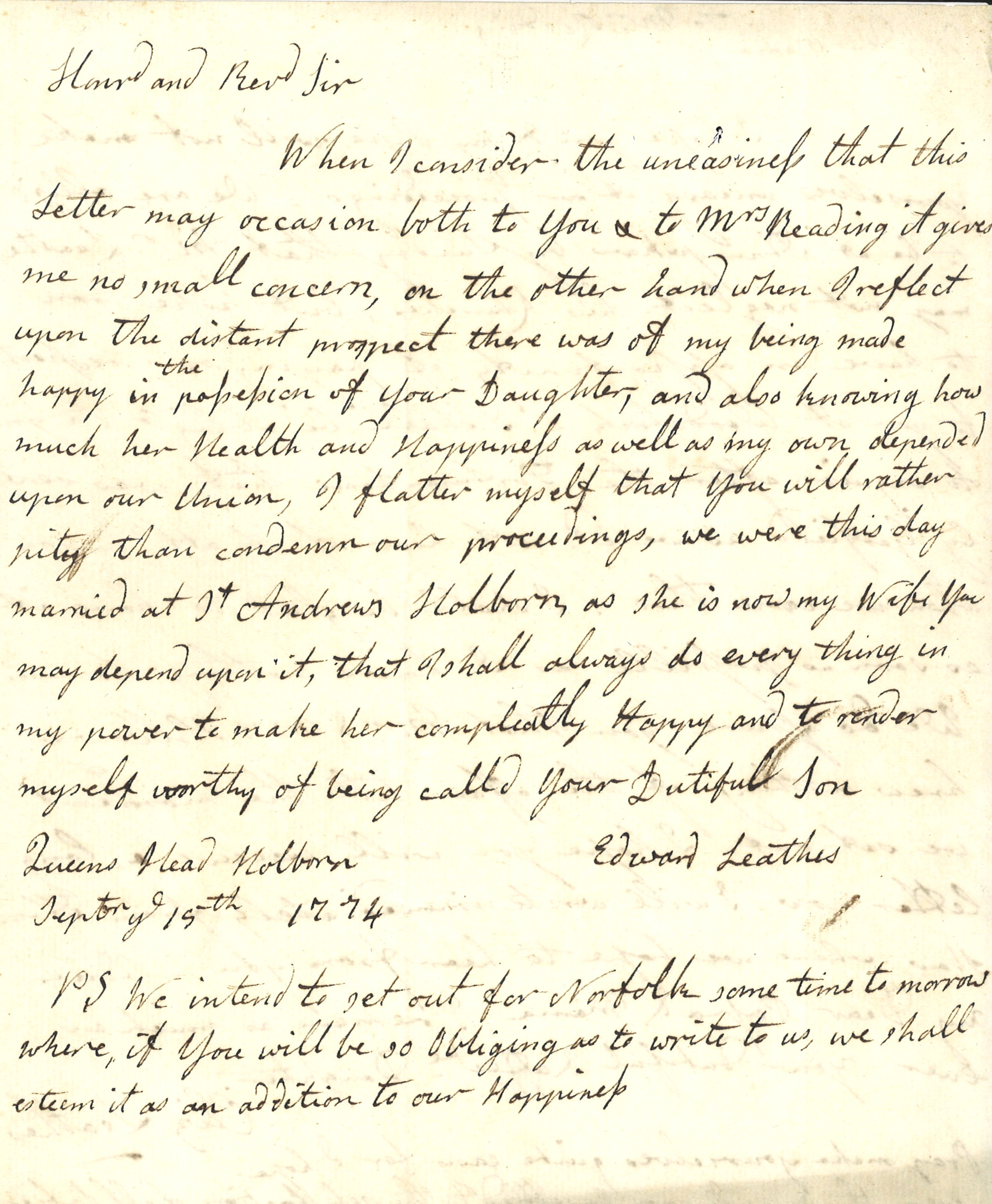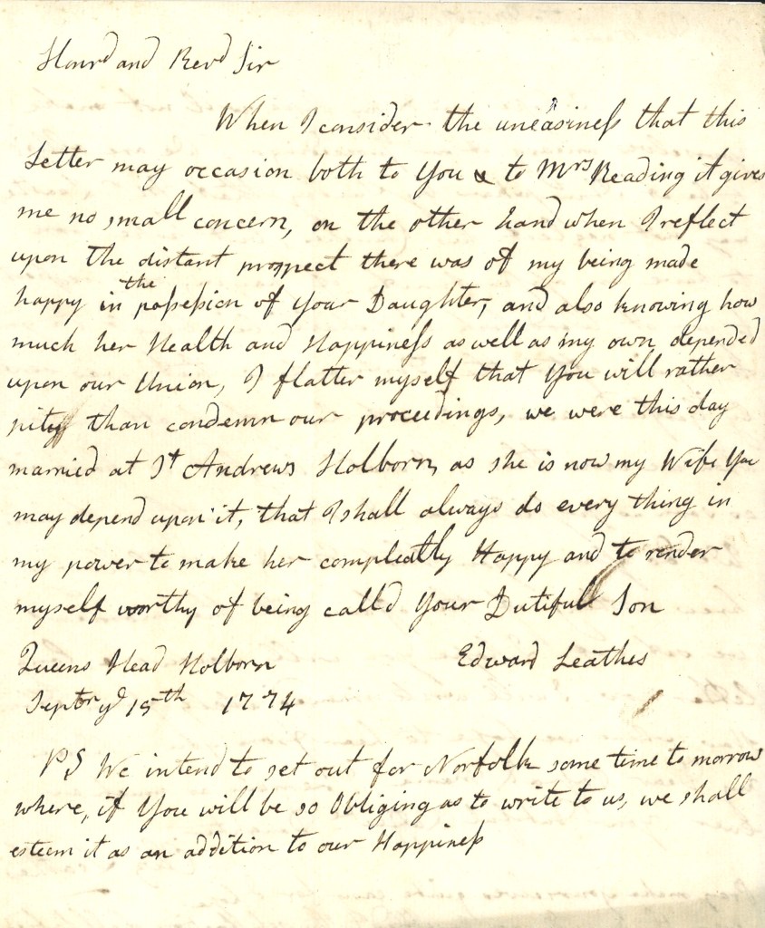 Once the couple were married, they wrote letters to Betsy’s parents to tell them of the news, both copied below. Edward Leathes to Betsy’s father James: