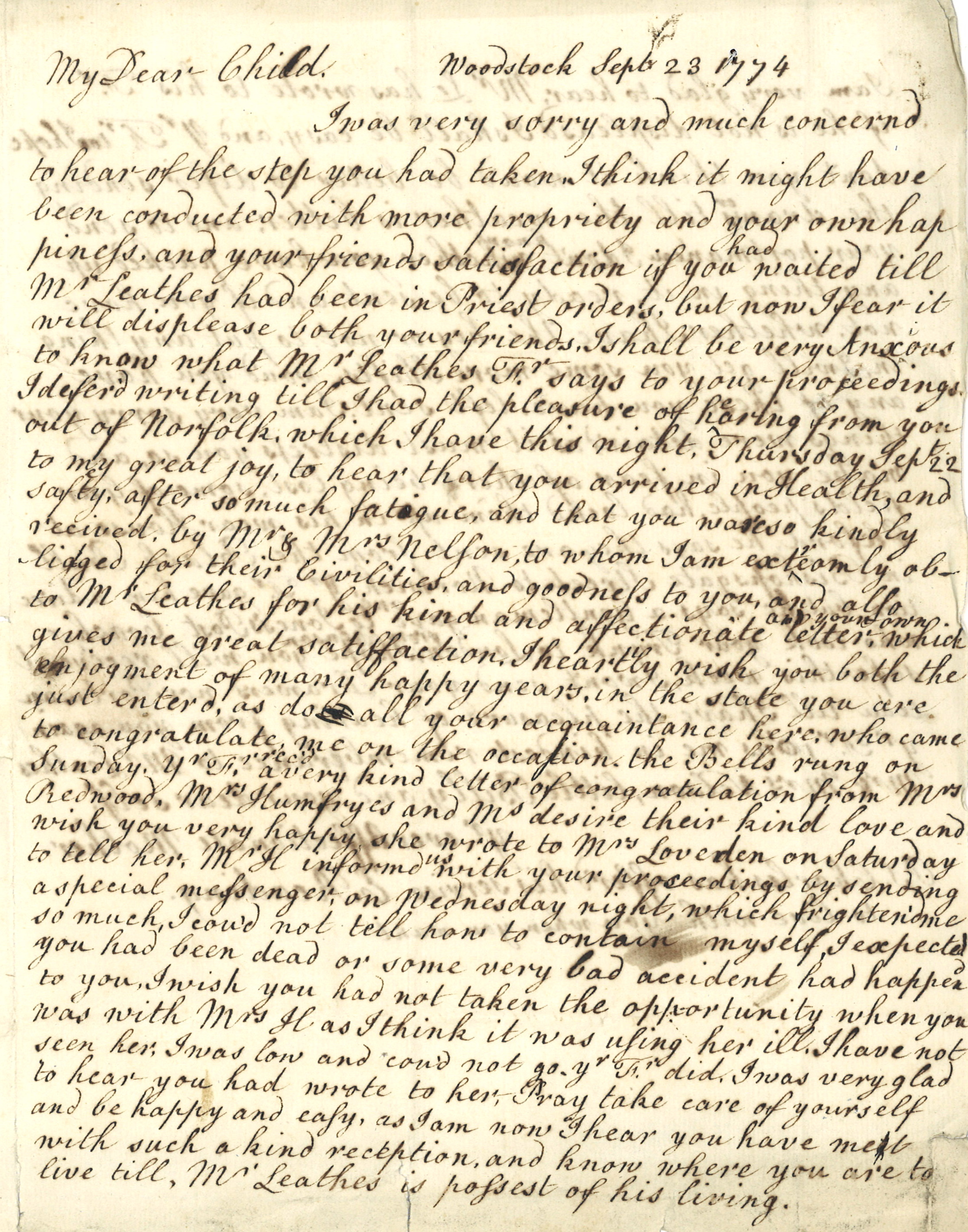 The final letter included in this blog is from Betsy’s mother, who leaves it over a week before replying to her daughter’s letter. On 23 September 1774, Elizabeth writes to express her opinion on the secret nuptuals and also discusses domestic matters including sending clothes and furniture to Betsy. Elizabeth does not hold back in the first few lines: