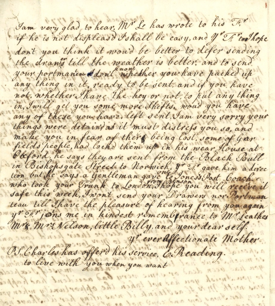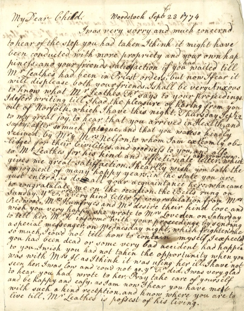 23 September 1774, Elizabeth Reading to daughter Elizabeth ‘Betsy’ Leathes. NRO, BOL 2/6/18.