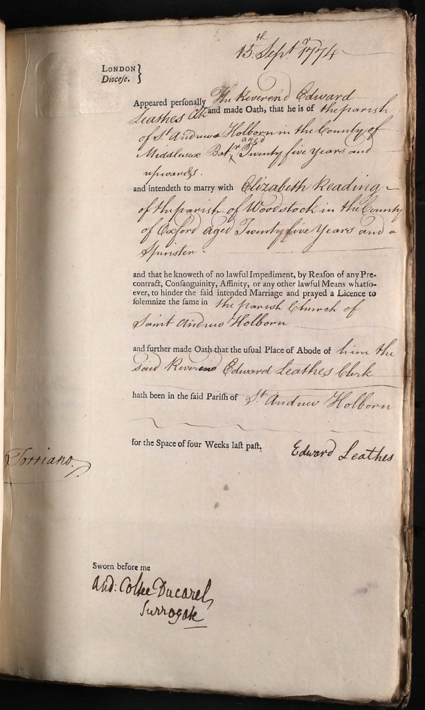 Marriage bond/allegation for Edward Leathes and Elizabeth ‘Betsy’ Reading. 15 September 1774.