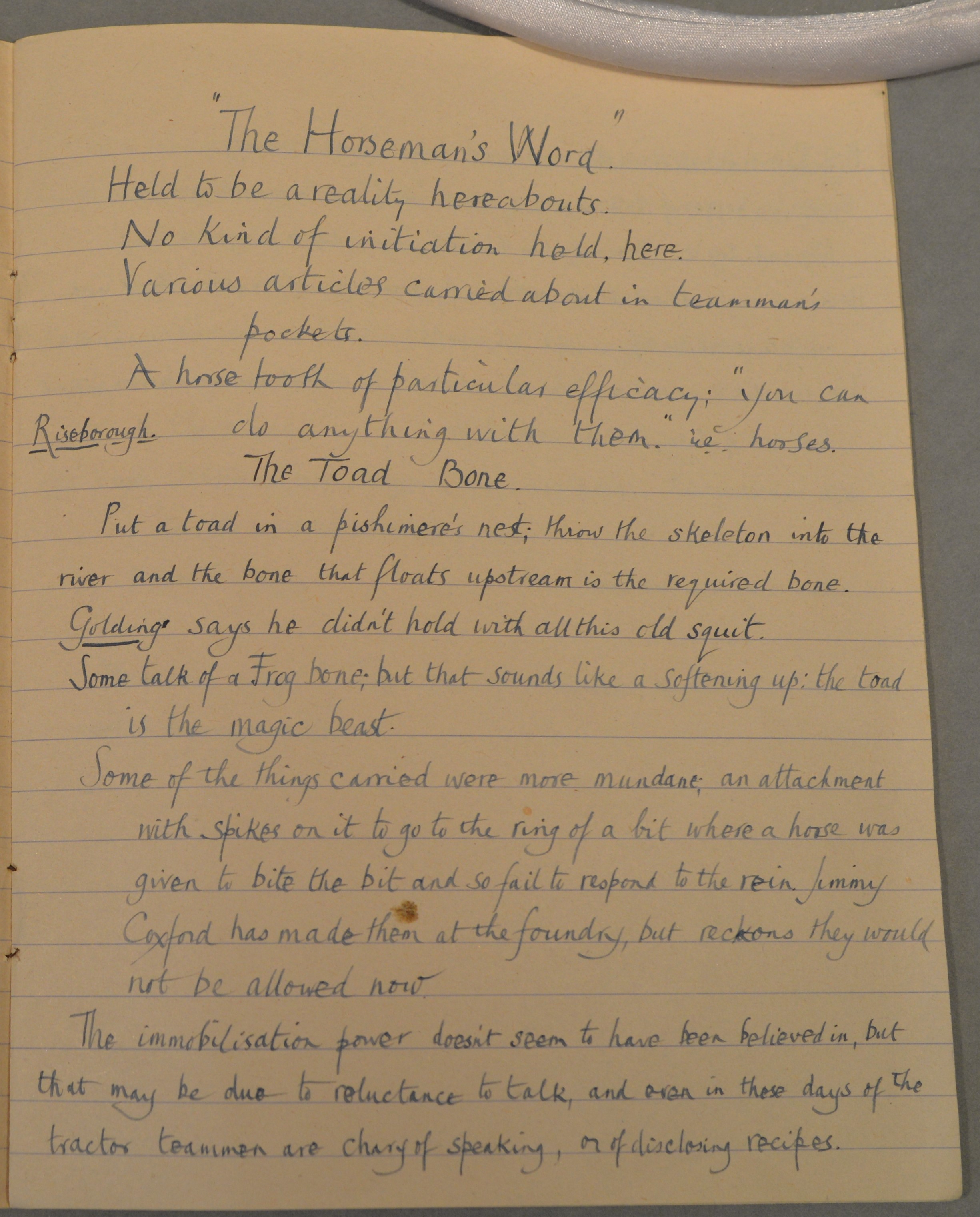 An NRO document entitled ‘Folklore: Veterinary Cures and Recipes – The Horseman’s Words and Charms’ (NRO, MS 21630/147 502X2) gives us detailed insight into the origins of the phrase. Written in approximately 1958, it clearly demonstrates the superstitious fears that were held by rural communities as late as the twentieth century. The small exercise book has been written by two unknown hands, both of whom appear to be local clergymen.