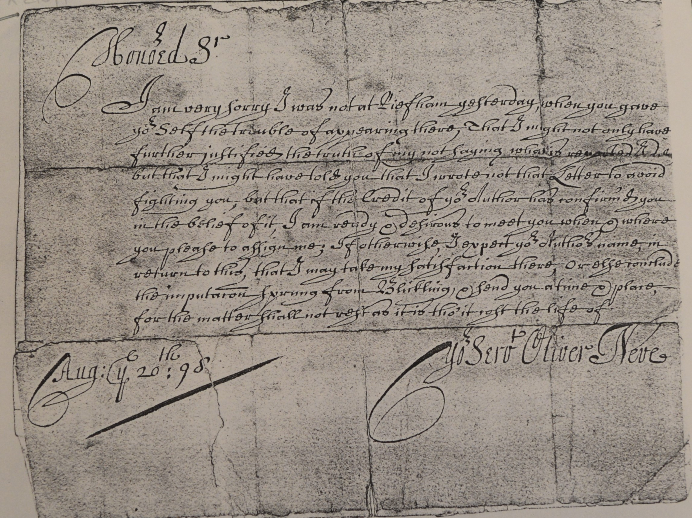 Acceptance of challenge to a duel, written to Sir Henry Hobart from Oliver Le Neve, 20 August 1698 (NRO, FX 210/1)