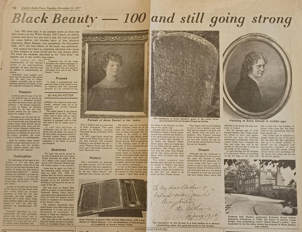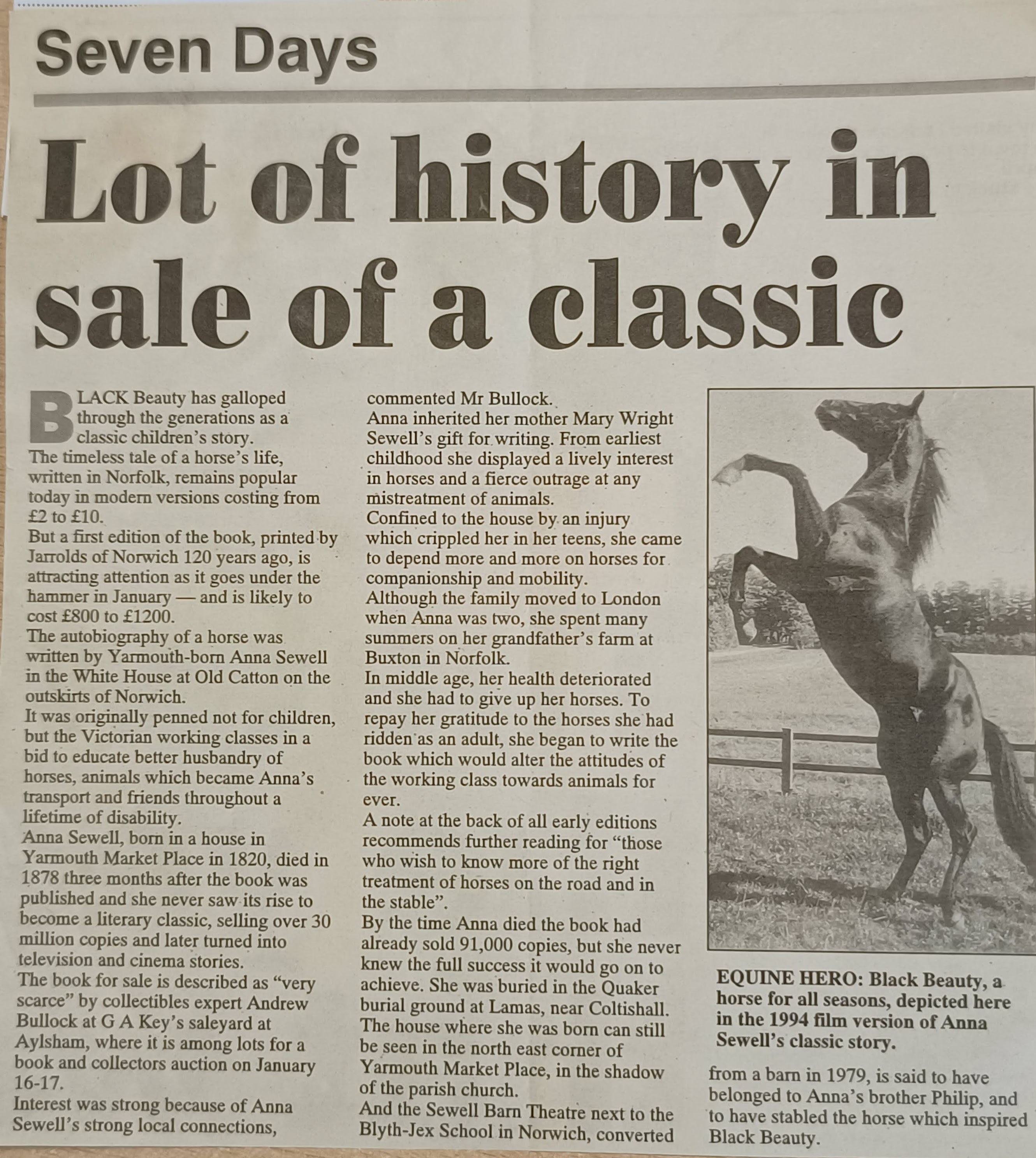 The “autobiographical” horse tale, whose full title was “Black Beauty: His Grooms and Companions, the Autobiography of a Horse”, was published by Norfolk’s own Jarrold & Sons in November of 1877 and gave a first ‘person’ account of the life of a young foal, through pulling cabs in London through to retirement and the acts of both kindness and cruelty that the title character endured along the way. Not only a tale of animal welfare, the book also illuminates how to treat people with kindness and respect and became an instant best-seller.
