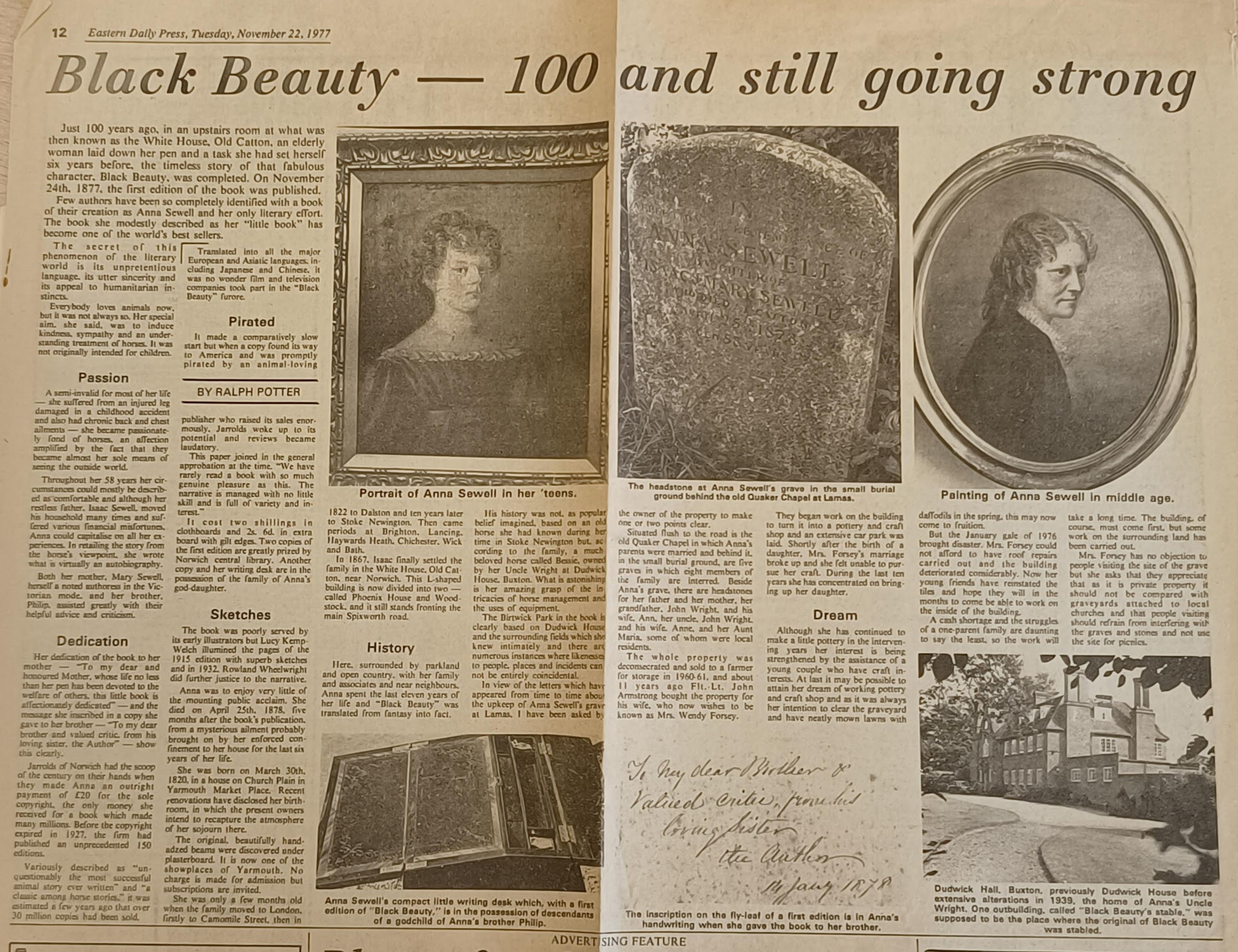 Anna’s frailty was such that she could not walk far and would get around by horse & cart or by cab; this is where her love of horses came from and where she also witnessed the cruelty they suffered. So it was that she would later write her story, which was not aimed at children, but rather at highlighting the plight of horses and encouraging their improved treatment. According to the Sewell family, the idea for both Black Beauty and the setting of the tale, Birtwick Park, are based on Dudwick Hall, Buxton, where Anna and her brother had spent some time when they were young, with her Uncle Wright.