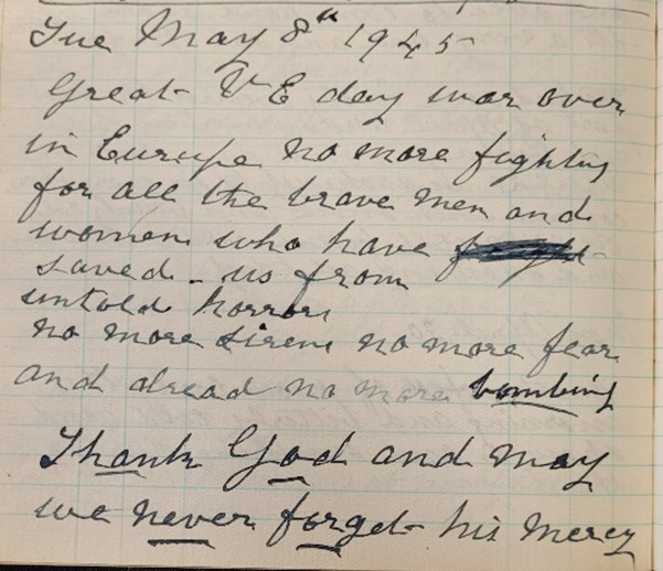 This is the entry in Agnes Podd’s diary, held in the Norfolk records office and which sums up the relief she, and everyone else, felt at the end of war in Europe. She had kept this diary since 1st January 1938 and recorded the every day activities and thoughts of an ordinary woman living through an extraordinary time. Throughout this scary, unusual period she continued to detail the day to day activities of her life whilst also recording the falling of bombs and the wailing of sirens. This is a truly fascinating insight into the experiences, thoughts and feelings of a local woman who lived through hardship and joy, set against the backdrop of war.