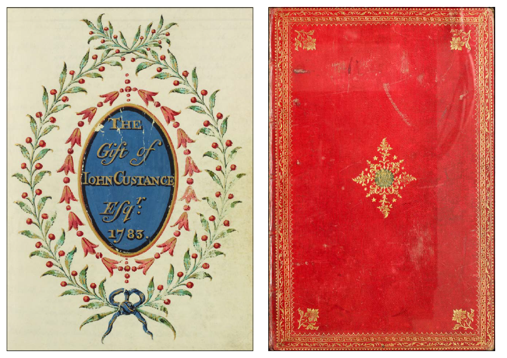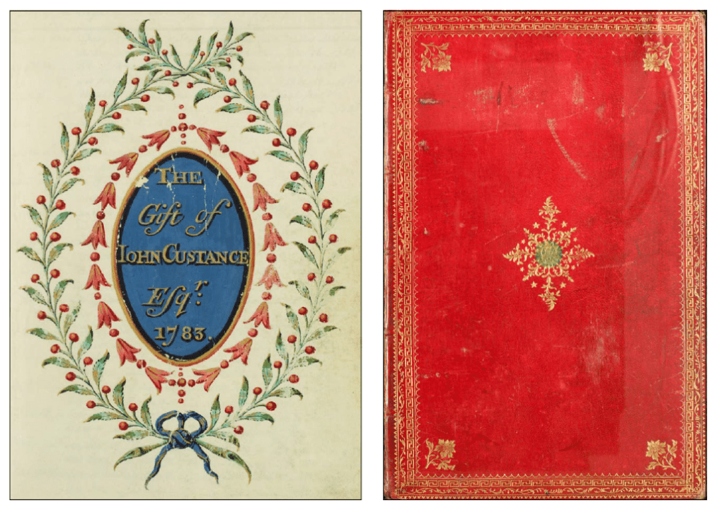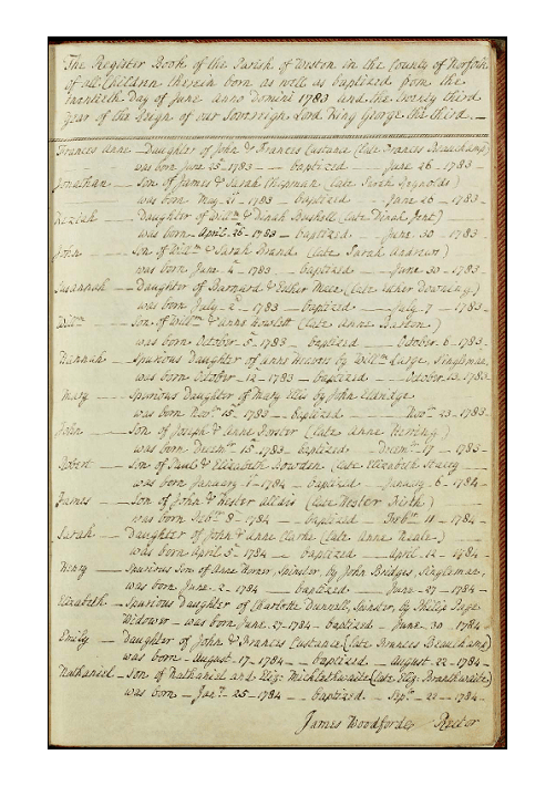 The first entry is for Frances Anne Custance, the fifth child and eldest daughter of John and Frances Custance of Weston House. Her father purchased the new register a few months before her birth, and had the title page elaborately inscribed. Two of his children are entered on the opening page, Emily’s birth following Frances Anne’s fourteen months later. In his diary for 20 and 23 February 1783 Woodforde describes the gift to the parish of ‘a very handsome register . . . bound in red morocco leather’.