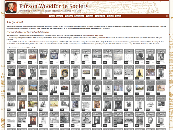 Feel free to browse this exciting new site with its mass of colourful images. All 207 of the Parson Woodforde Society Journals published since our foundation have been scanned and uploaded; more will follow as they are issued. You can download all these editions, with their scholarly articles, for free. You can also download the index, divided into five categories, which accompanies them. Each cover is displayed on the Journal webpage, a single click opening the full edition.