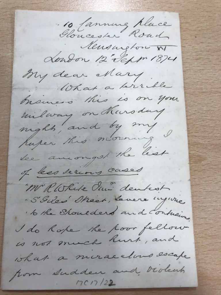 ‘My dear Mary, What a terrible business this is on your railway on Thursday night, and by my paper this morning I see amongst the list of ‘less serious cases’, ‘Mr R White, Junior, dentist St Giles. Severe injuries to shoulder and contusions.’ I do hope the poor fellow is not much hurt, and what a miraculous escape from sudden and violent death.’[iv]