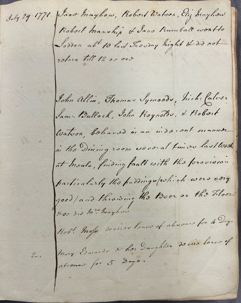 All this was before the Poor Law Amendment Act of 1834 and the advent of the harsh workhouse system so criticised by Dickens in Oliver Twist. The report book suggests that, whilst workhouse life was far from a bed of roses, it was not overly harsh. Paupers were not afraid to criticise the food: on 22 July 1771, the governor stated that inmates had complained about the beer. A week later, he reported that six paupers ‘behaved in an indecent manner in the Dining room several times last week at meals, finding fault with the provision particularly the puddings (which were very good) and throwing the Beer on the Floor’.